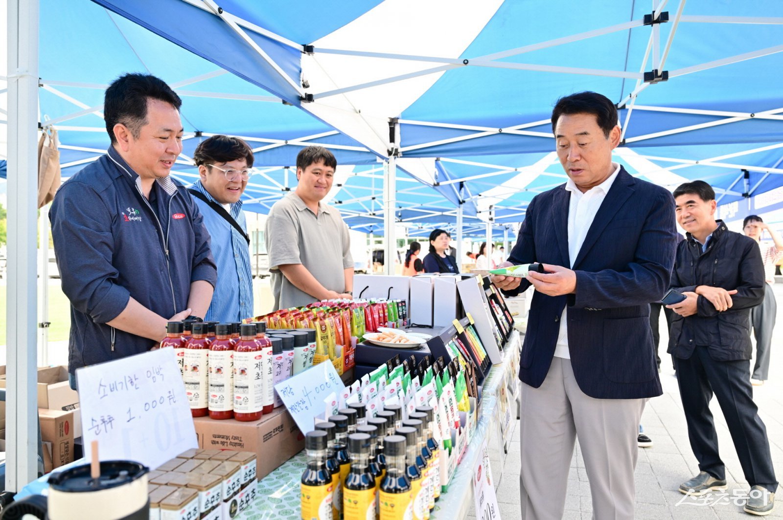 백영현 시장(오른쪽 두번째)이 지난 18일 시청 광장에서 추석 명절 선물세트 특별 판매전에서 격려를 하고 있다. 사진제공ㅣ포천시