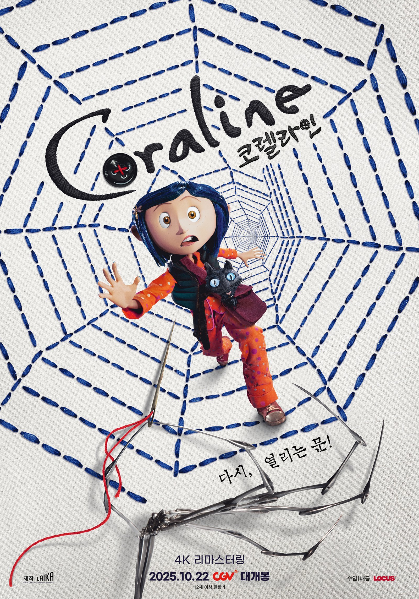 먼저 메인 포스터는 비밀의 문을 통해 자신이 원하는 완벽한 ‘다른 세계’를 만났던 코렐라인이 위기에 빠진 순간을 포착해 내 긴박감을 전한다. 특히 극 중 빌런인 마녀의 바늘 손이 만든 거미줄 덫에서 벗어나려 하는 명장면을 4K 리마스터링 개봉 기념 스페셜 비주얼로 담아내 시선을 사로잡는다. 코렐라인 그리고 함께 도망가는 검은 고양이, 바늘손을 제외하고 모든 것이 스티치로 표현된 것. 자수를 놓던 중인지, 코렐라인을 찌르려는 것인지 오싹함을 선사하는 바늘의 위치와 ‘다시, 열리는 문!’이라는 카피 문구는 ‘코렐라인’의 매력을 연상시킨다. 또한, 텍스처 질감의 배경에 자수로 놓인 ‘코렐라인’ 제목과 거미줄의 모습은 영화 속 ‘다른 세계’만큼이나 기묘하면서도 독특한 미감을 선사하며 영화에 대한 기대를 높인다.