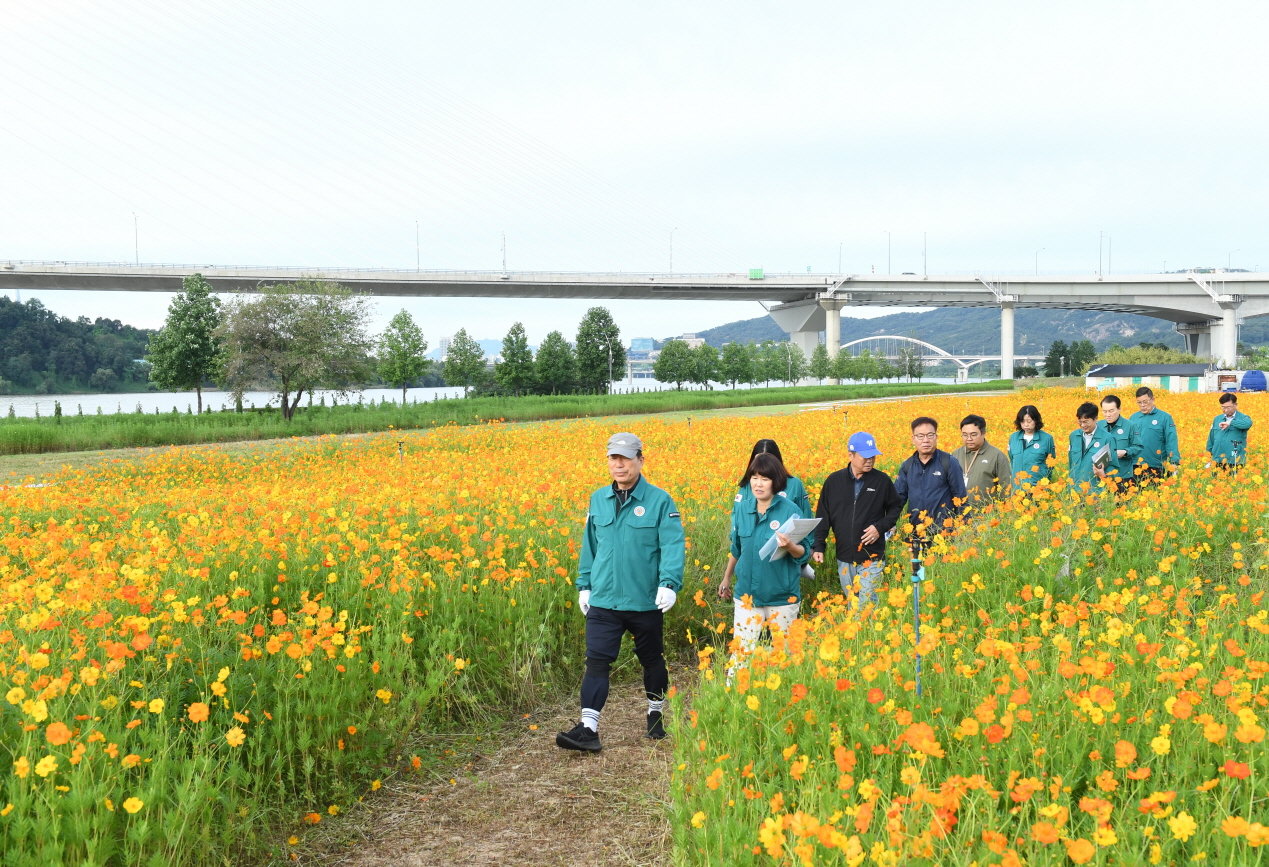 백경현 시장(맨앞)이 오는 26일 개막하는 ‘2025 구리 코스모스 축제’를 앞두고 행사장인 구리한강시민공원에서 사전 현장 점검하고 있다. 사진제공ㅣ구리시