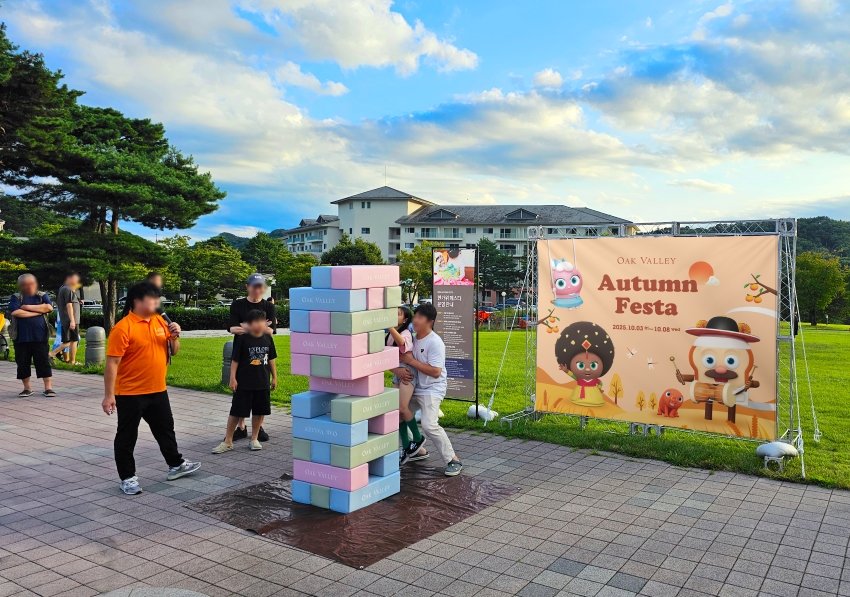 행사는 오크밸리 빌리지센터 인근 잔디광장과 소나무 숲에서 열린다. 상생 마켓 존에서는 수공예품, 지역 먹거리, 페이스 페인팅 등을 만날 수 있고, 전통 체험존에서는 활쏘기, 투호, 제기차기, 윷놀이 등 고유의 놀이를 경험할 수 있다. 매일 오후 5시 열리는 대형 젠가 대항전은 가족 간 팀워크를 겨루며 리조트 숙박권, 조식 이용권, 스타벅스 쿠폰 등 다양한 경품의 기회를 제공한다.