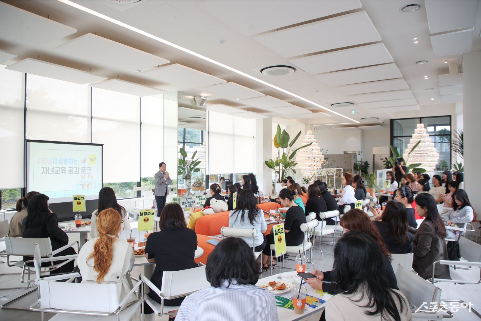 주광덕 시장(왼쪽)은 23일 화도읍 카페에서 화도·수동·평내·호평 지역 ‘중·고등 학부모 미래교육공동체 아카데미’에서 인사말을 하고 있다. 사진제공ㅣ남양주시