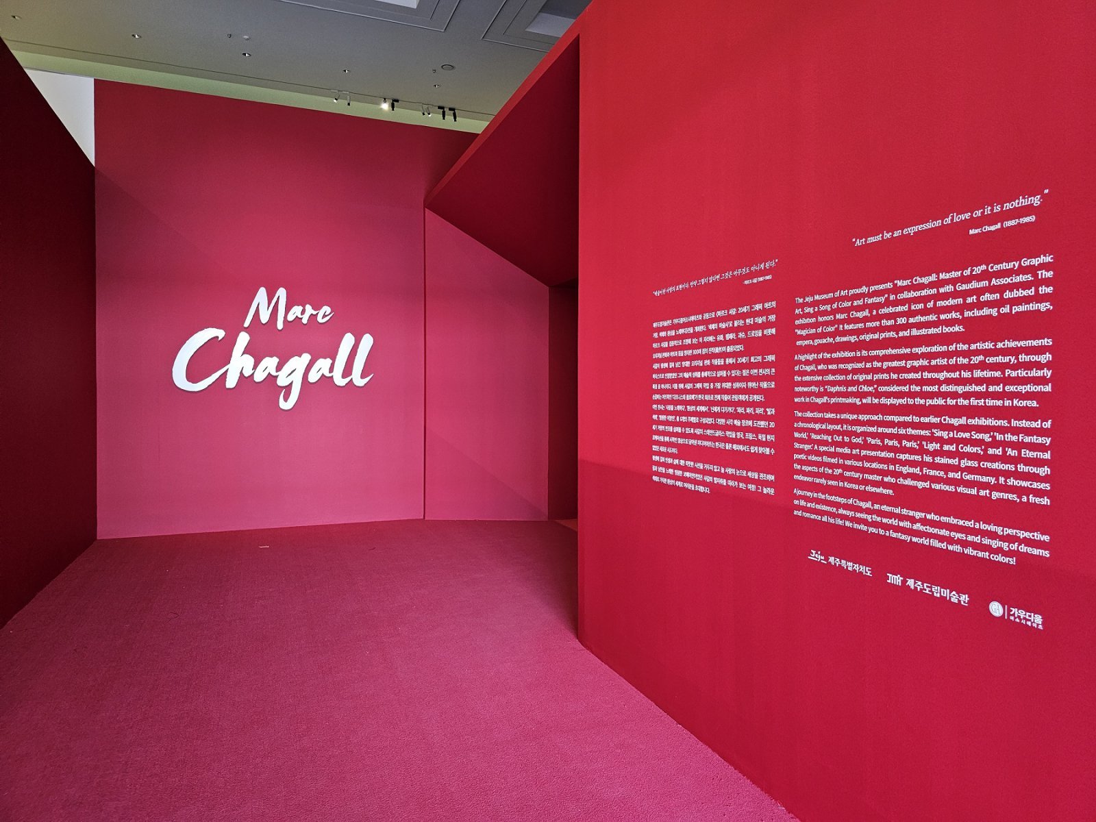 샤갈 전시는 ‘마르크 샤갈: 20세기 그래픽 아트의 거장, 환상과 색채를 노래하다’라는 주제로 오는 10월19일까지 제주도립미술관에서 열린다. 원작 350여 점이 한자리에 모인 이번 전시는 샤갈의 환상적 색채를 제주에서 직접 만날 수 있는 이례적인 기회로 평가받고 있다.