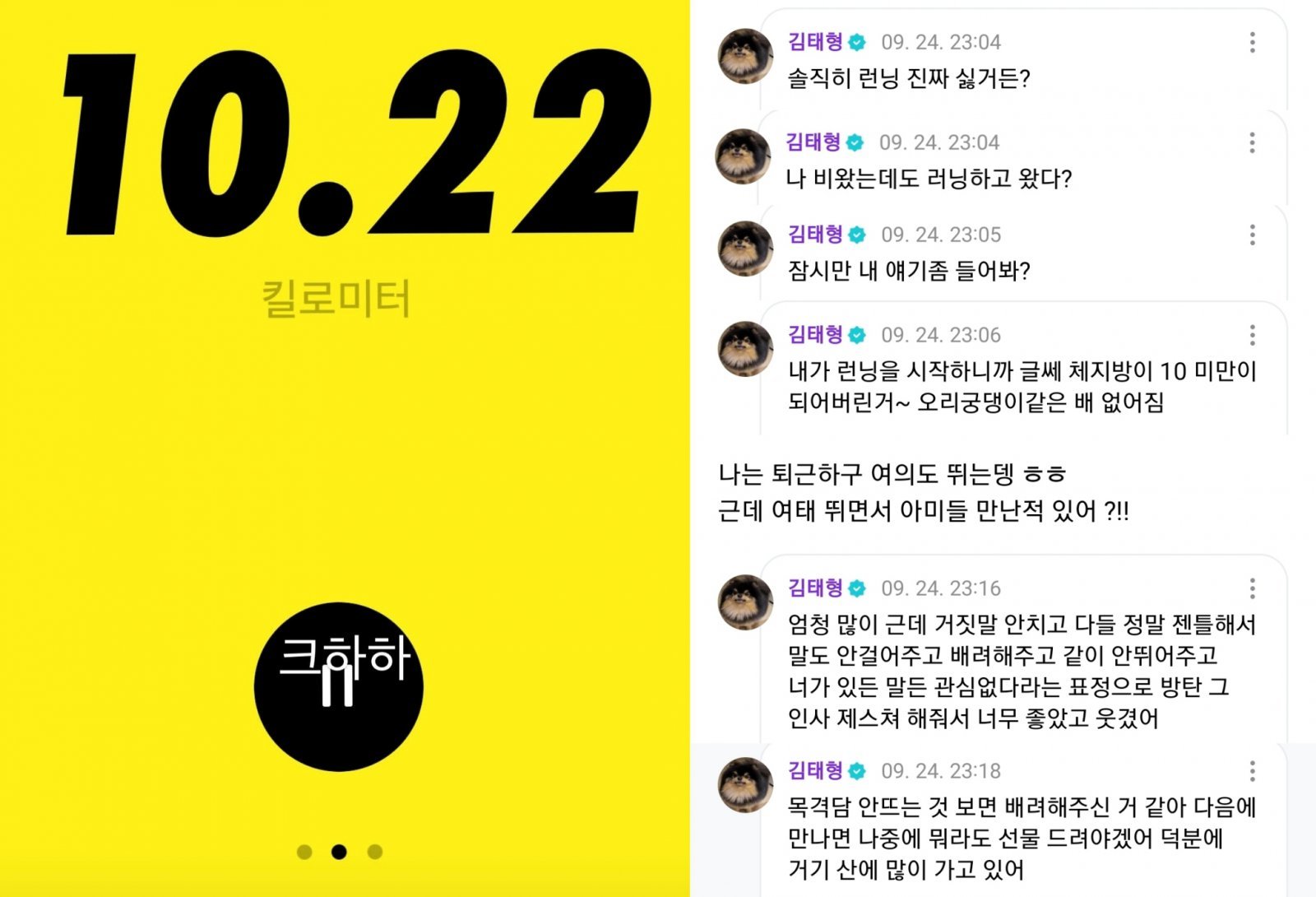 뷔는 러닝을 이어가며 팬들과 꾸준히 소통했다. 24일 위버스에서는 “비 오는 날에도 뛰었다”며 “처음에는 러닝이 싫었지만 지금은 체지방이 10미만이 됐다”고 만족감을 드러냈다.