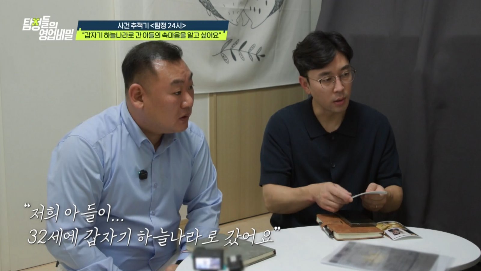 29일(월) 밤 9시 30분 방송되는 채널A ‘탐정들의 영업비밀’ 속 ‘탐정 24시’에서는 “젊은 나이에 갑작스럽게 세상을 떠난 아들의 흔적을 찾아달라”며 미국에서 멀리 날아온 어머니의 절절한 의뢰가 공개된다. 의뢰인의 아들은 올해 2월, 불과 32세의 나이로 세상을 떠났다.