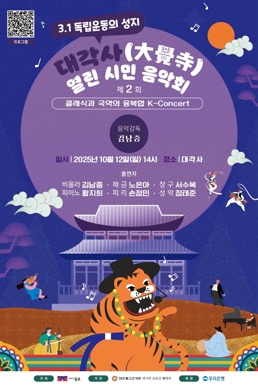 이번 음악회는 종로구가 주최하고 대한불교조계종 대각사가 주관, 우리은행이 후원한다. 세계적인 비올리스트 김남중이 음악감독을 맡아 프로그램을 구성했으며, 해금 연주자 노은아(서울대 국악과 교수), 장구 명인 서수복, 피아니스트 황지희, 피리 연주자 손정민, 성악가 정태준이 무대에 오른다. 국악의 신명과 서양음악의 서정이 한 무대에서 펼쳐지는 보기 드문 만남이다.
