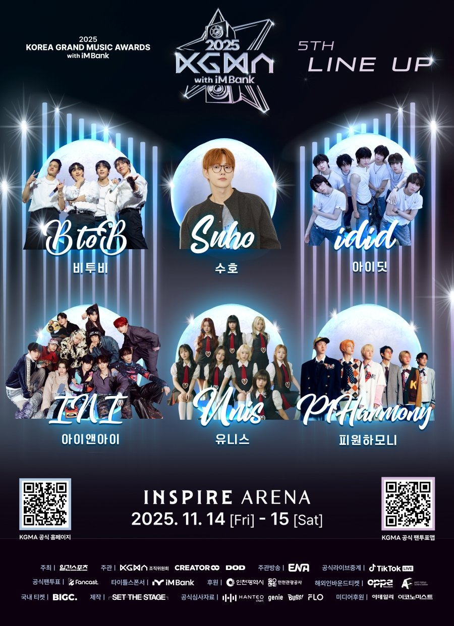 11월 개최되는 케이(K)팝 시상식 코리아 그랜드 뮤직 어워즈(KGMA)가 스페셜 라인업을 공개했다. 비투비와 엑소의 수호, 아이딧, 아이앤아이, 유니스, 피원하모니가 합류했다.