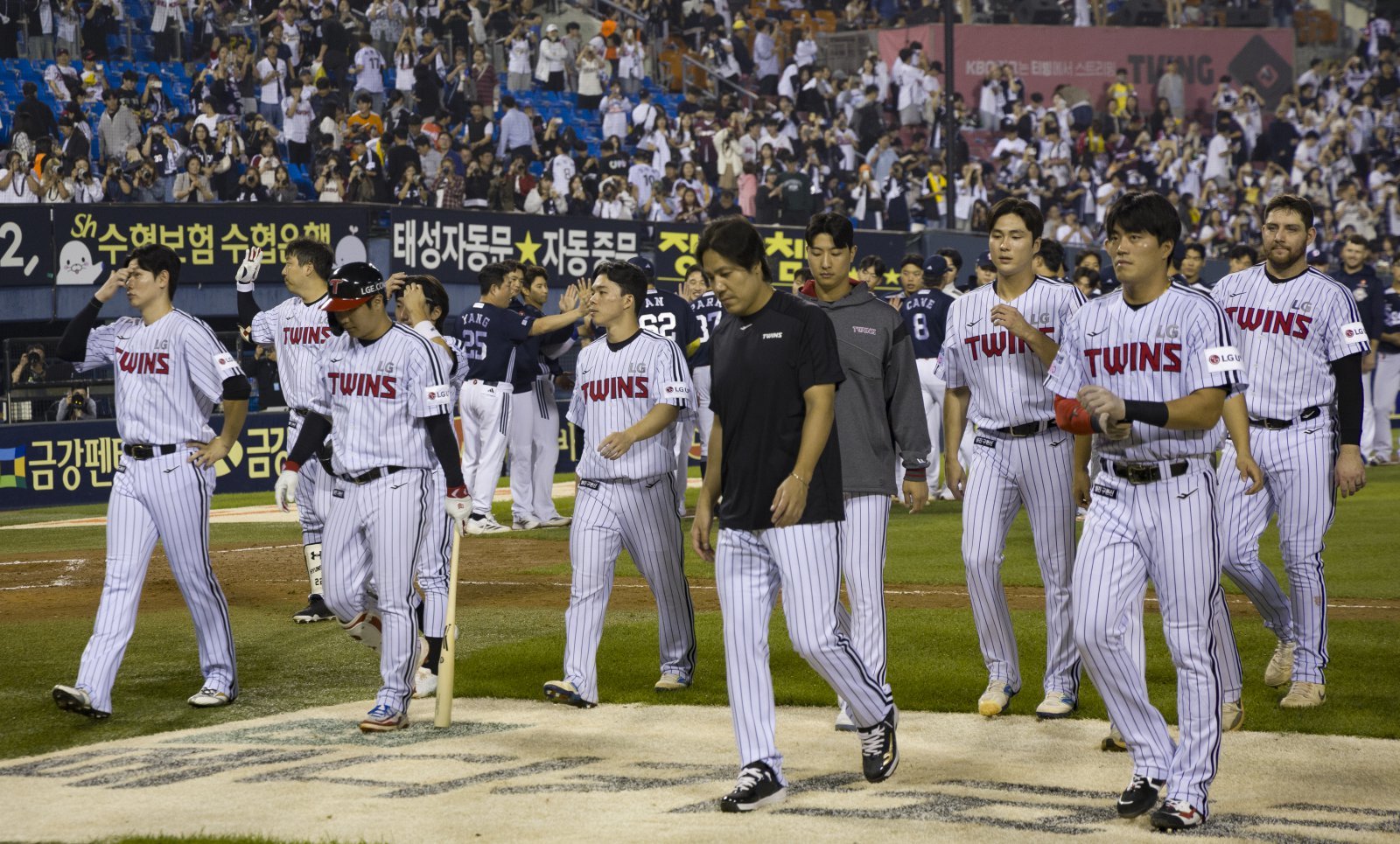 LG 선수단이 30일 잠실 두산전에서 0-6으로 패한 뒤 홈팬들에게 인사를 한 후 그라운드를 빠져 나가고 있다. LG는 30일 경기에서도 정규시즌 우승 매직 넘버 ‘1’을 지우지 못했다. 2위 한화와 정규시즌 우승 경쟁은 10월까지 이어지게 됐다. 잠실|뉴시스