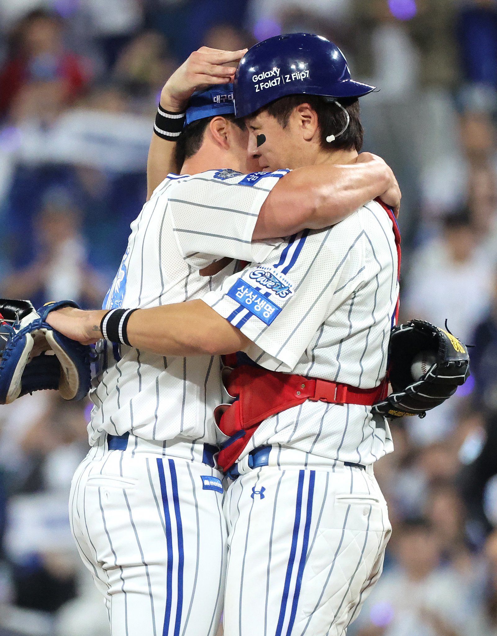 삼성 오승환(왼쪽)이 30일 대구 KIA전이 끝난 뒤 은퇴식을 갖고 그라운드와 작별을 고했다.