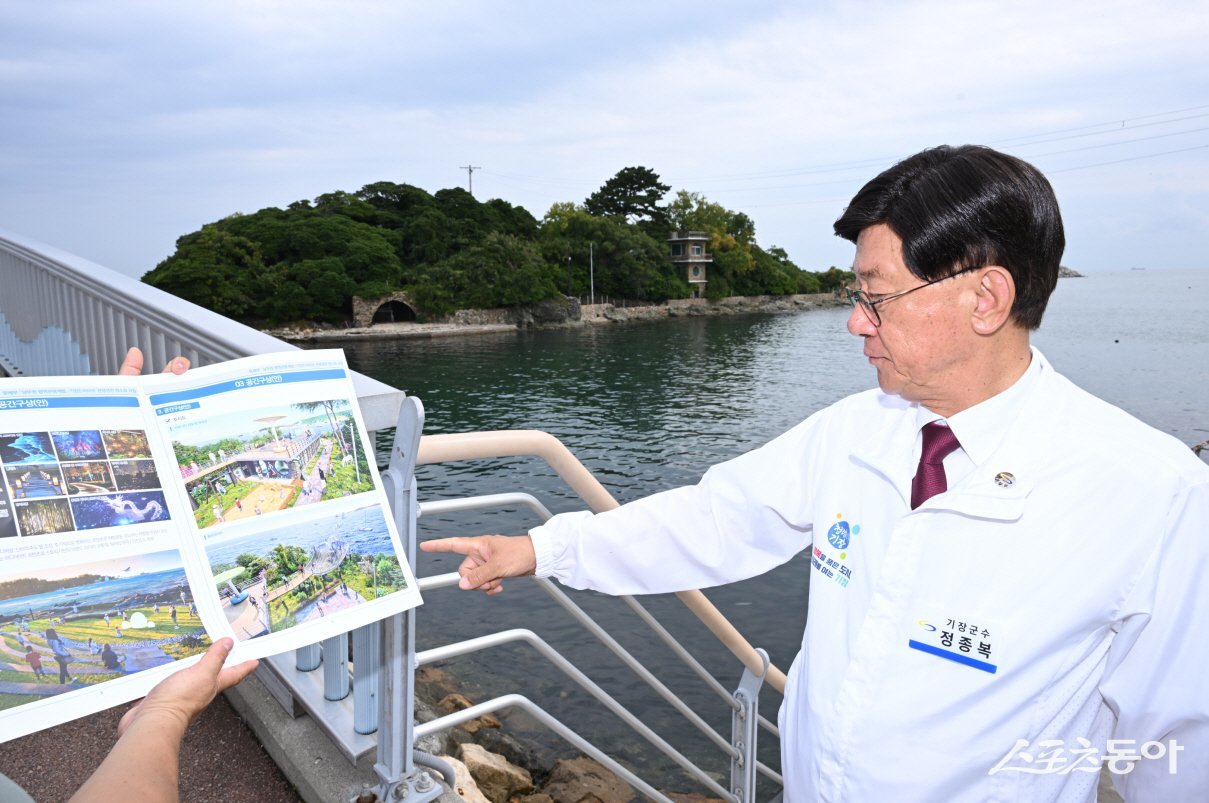 정종복 기장군수가 죽도 관광자원화 사업 현장을 점검하고 있다. (사진제공=기장군)