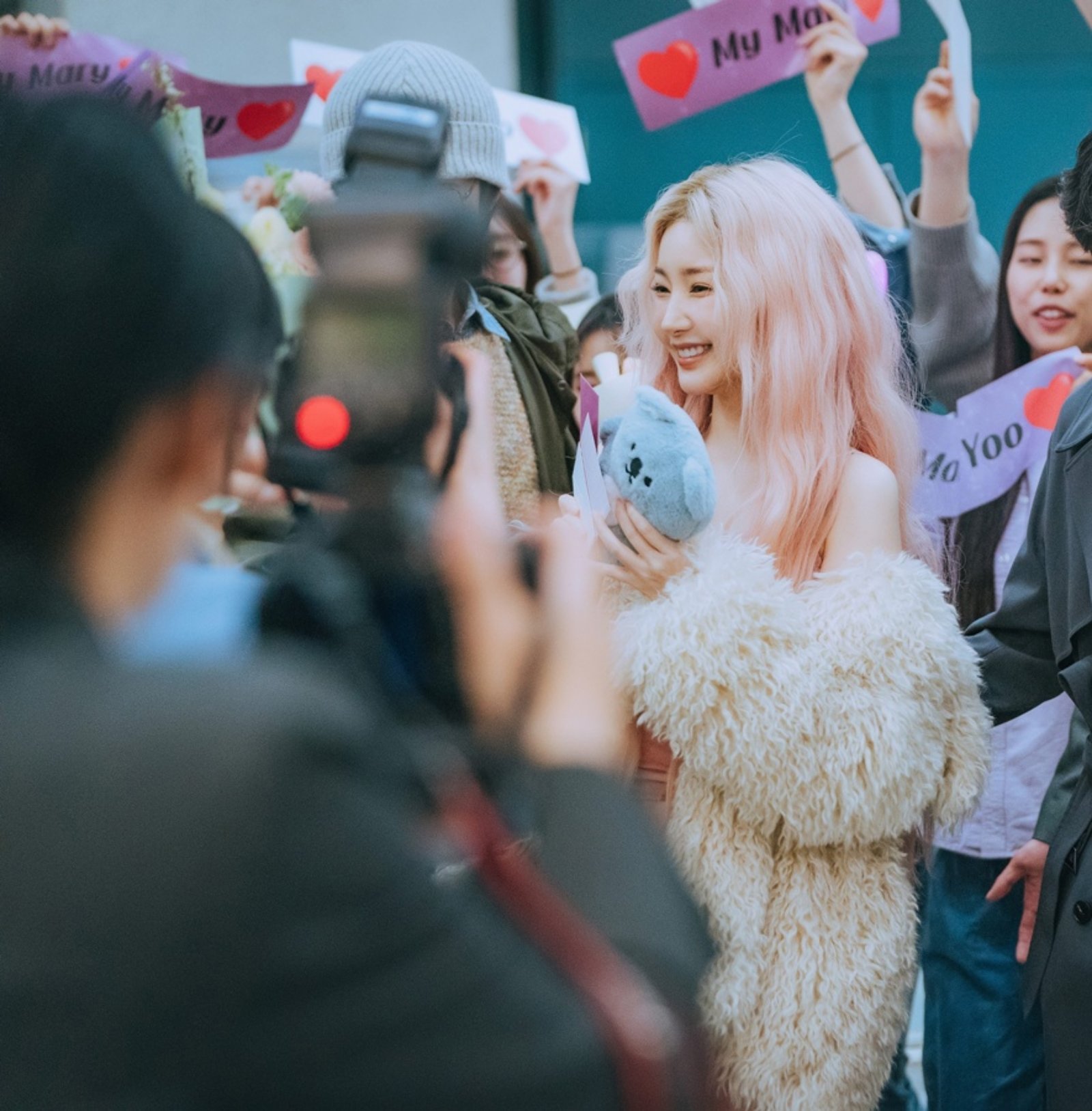먼저 윤이랑은 핑크색 웨이브 머리에 미니 원피스, 화려한 퍼 재킷으로 빛나는 비주얼을 자랑하며 공항에 입국하고, 공항이 마비될 듯 인산인해를 이룬 팬들에게 인사하며 인기 절정 톱스타 메리유의 본캐 매력을 드러낸다.