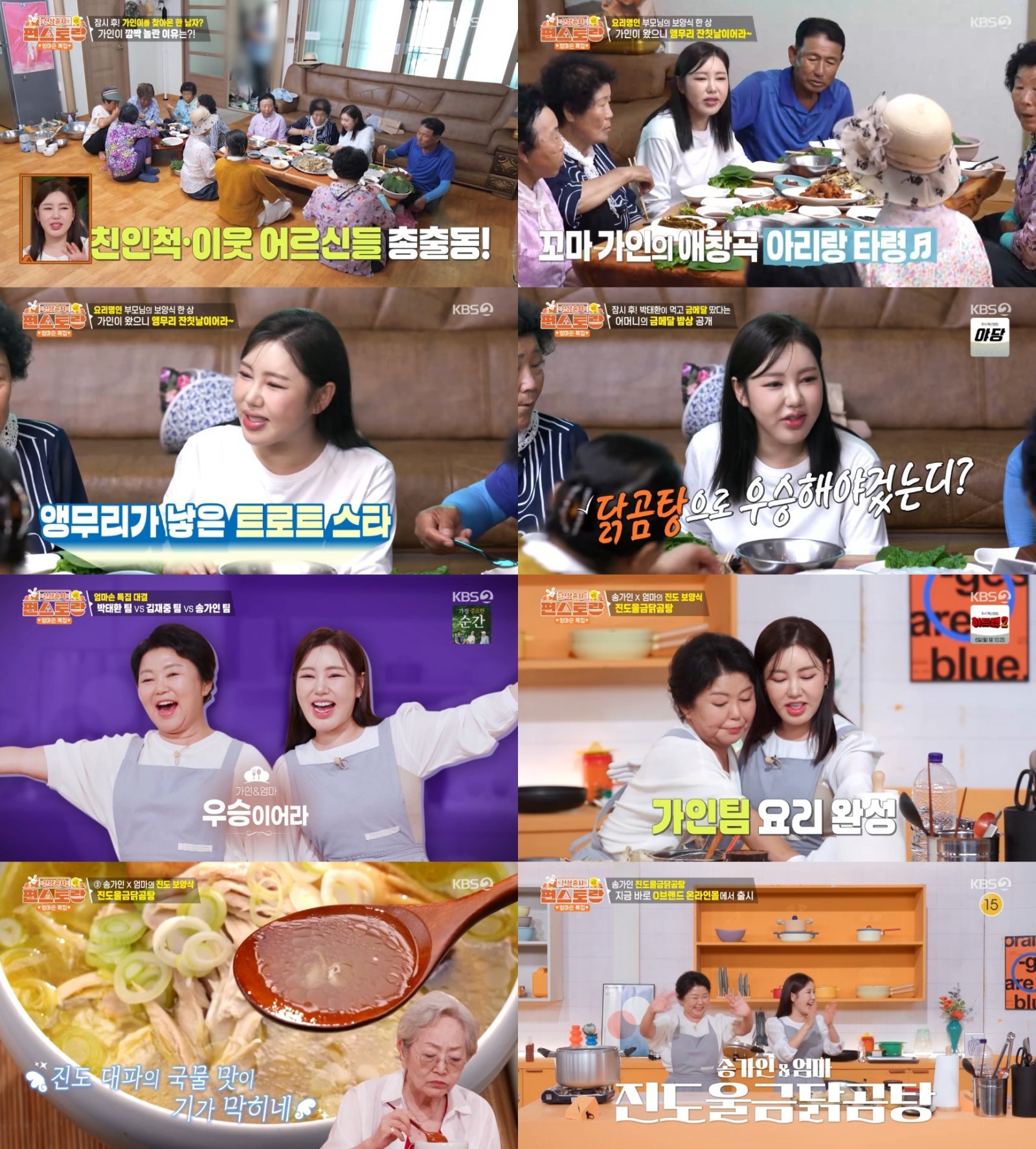 어르신들은 송가인에 대해 “어렸을 때부터 노래를 그렇게 잘했다”라며 “지금은 대한민국 1등 가수가 됐다”라고 뿌듯한 마음을 드러냈다. 그렇게 잔치를 즐긴 어르신들은 대결 메뉴로 닭곰탕을 선택했다.