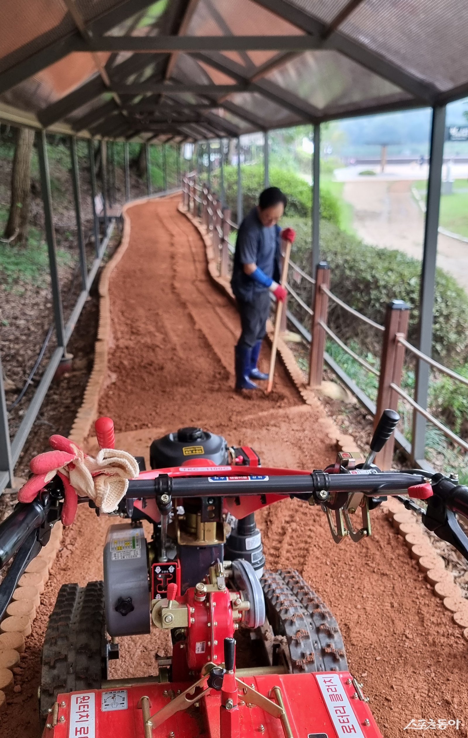 다른 1곳인 구미동 공공공지 내 750m 길이의 황톳길은 로터리 기기를 내년도에 추가 구매한 뒤 흙 뒤집기 작업을 한다.