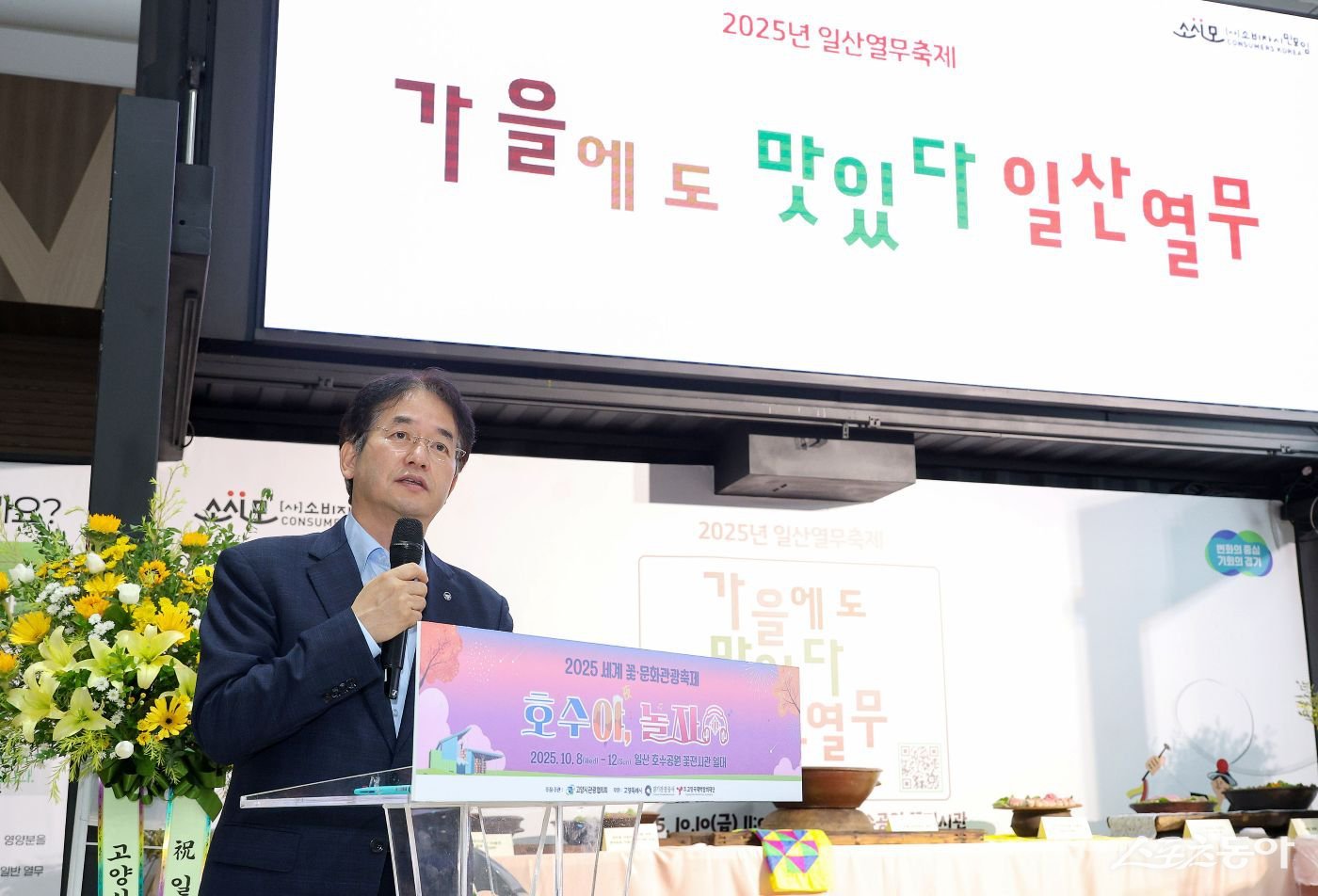 이동환 고양특례시장이 지난 10일 고양꽃전시관에서 열린 ‘2025년 일산열무축제’에 서 인사말을 하고 있다. 사진제공ㅣ고양시