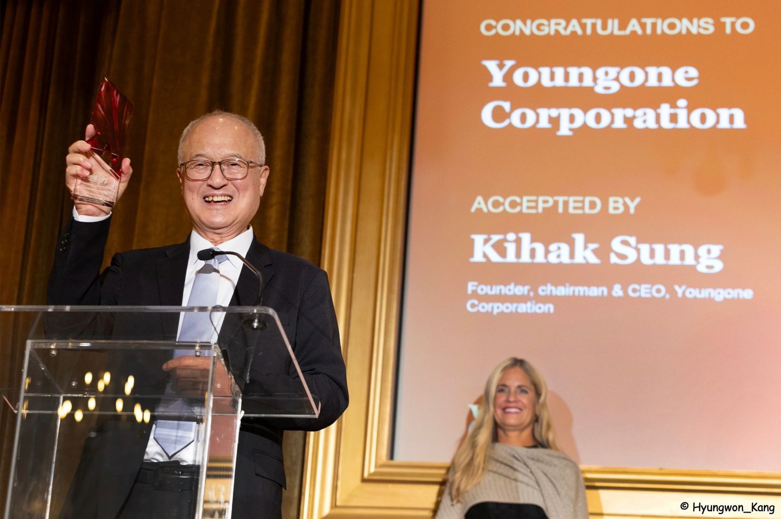 6일(현지시간) 미국 시카고 드레이크 호텔에서 열린 ‘2025 WCD 비저너리 어워즈’에서 영원무역 성기학 회장이 수상하고 있다. 영원무역 제공