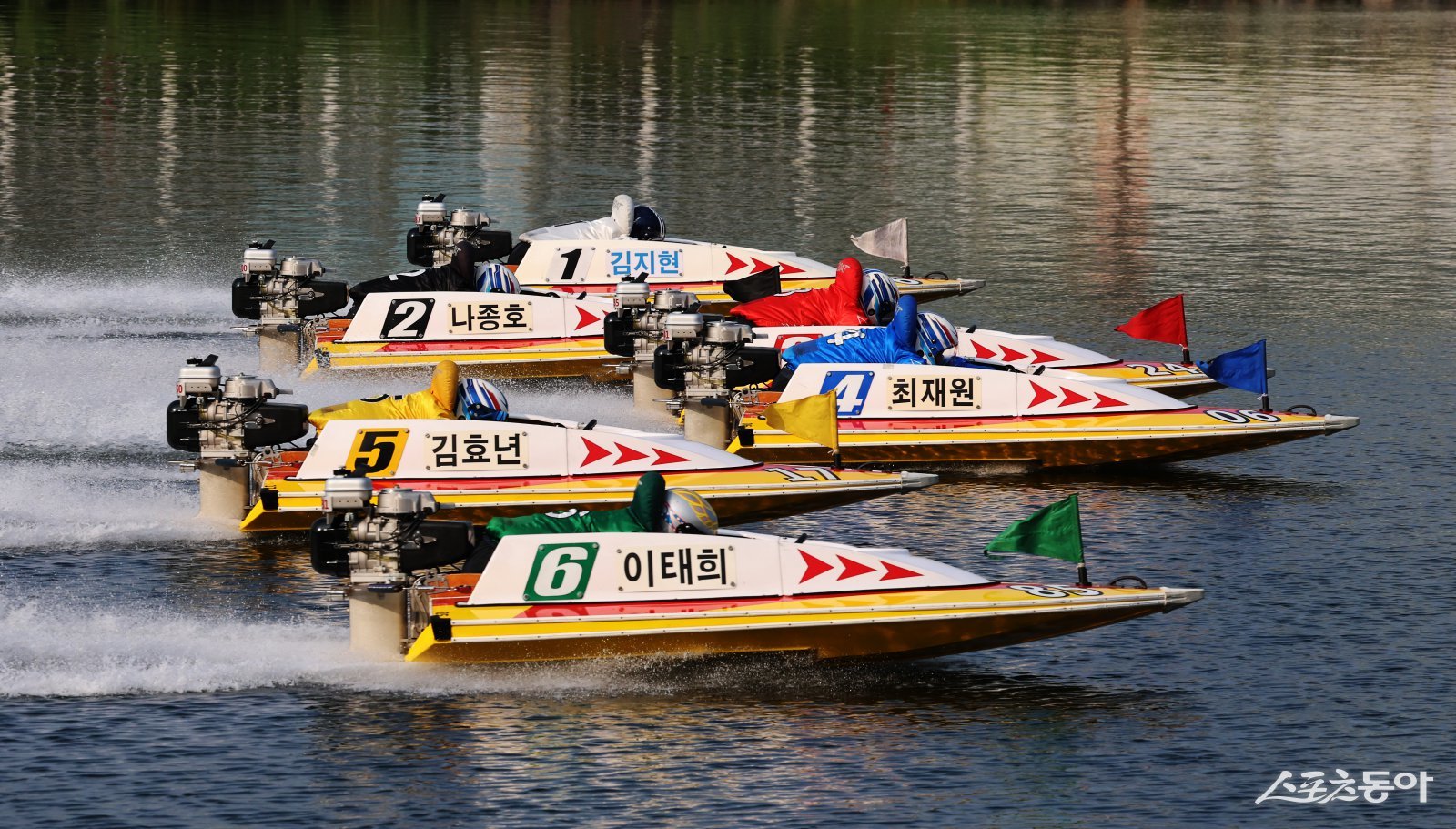 미사경정장에서 선수들이 플라잉 스타트로 경주를 시작하고 있다.
