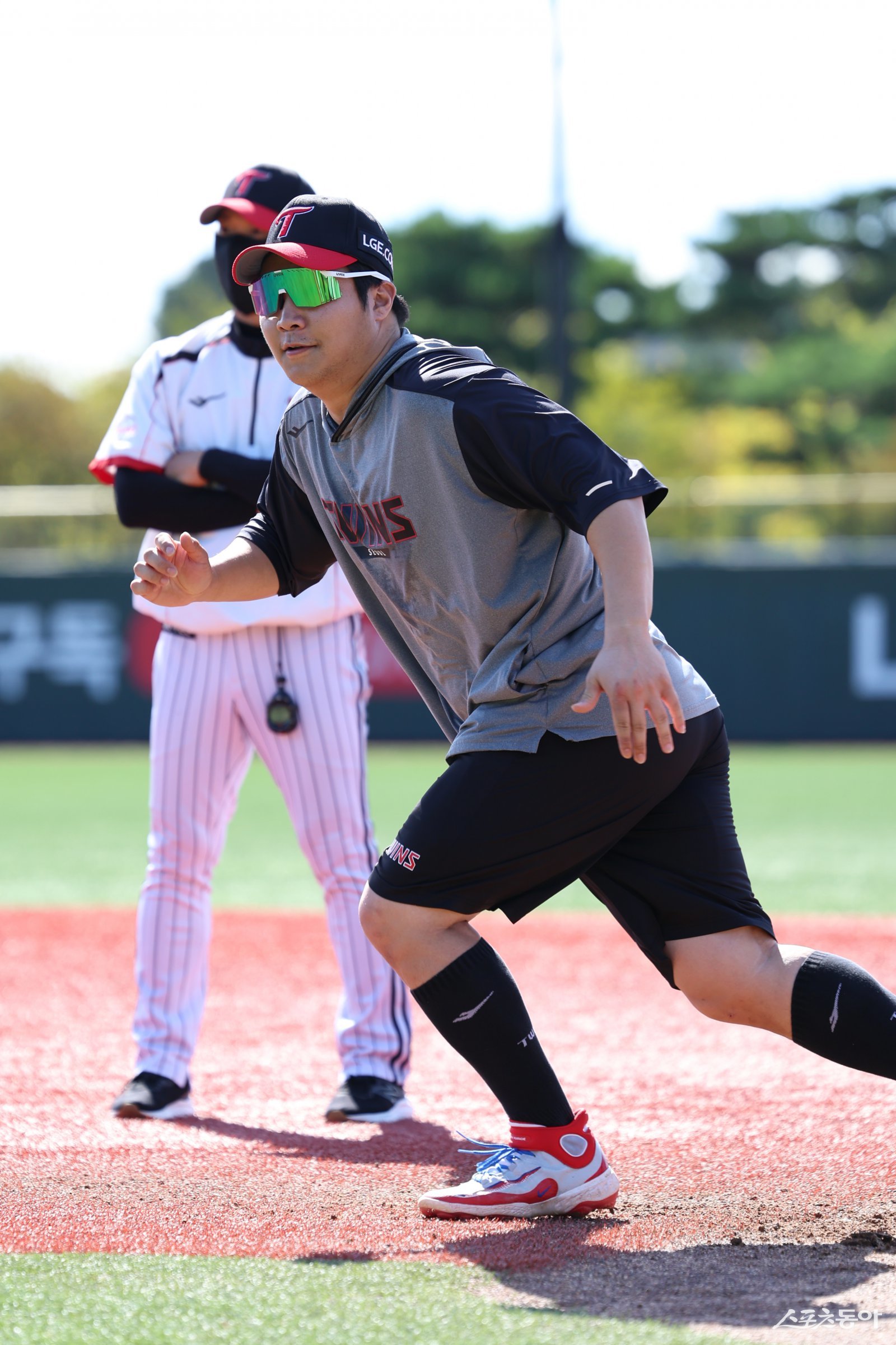 LG 문보경이 9일 이천 LG챔피언스파크에서 열린 한국시리즈 대비 합숙 훈련 도중 주루 훈련을 소화하고 있다. 사진제공|LG 트윈스
