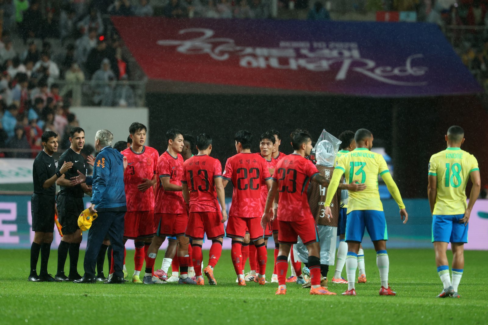 축구대표팀 선수들이 10일 서울월드컵경기장에서 열린 브라질 평가전을 마친 뒤 상대 선수들의 등을 두드리며 격려하고 있다. 사진제공|대한축구협회