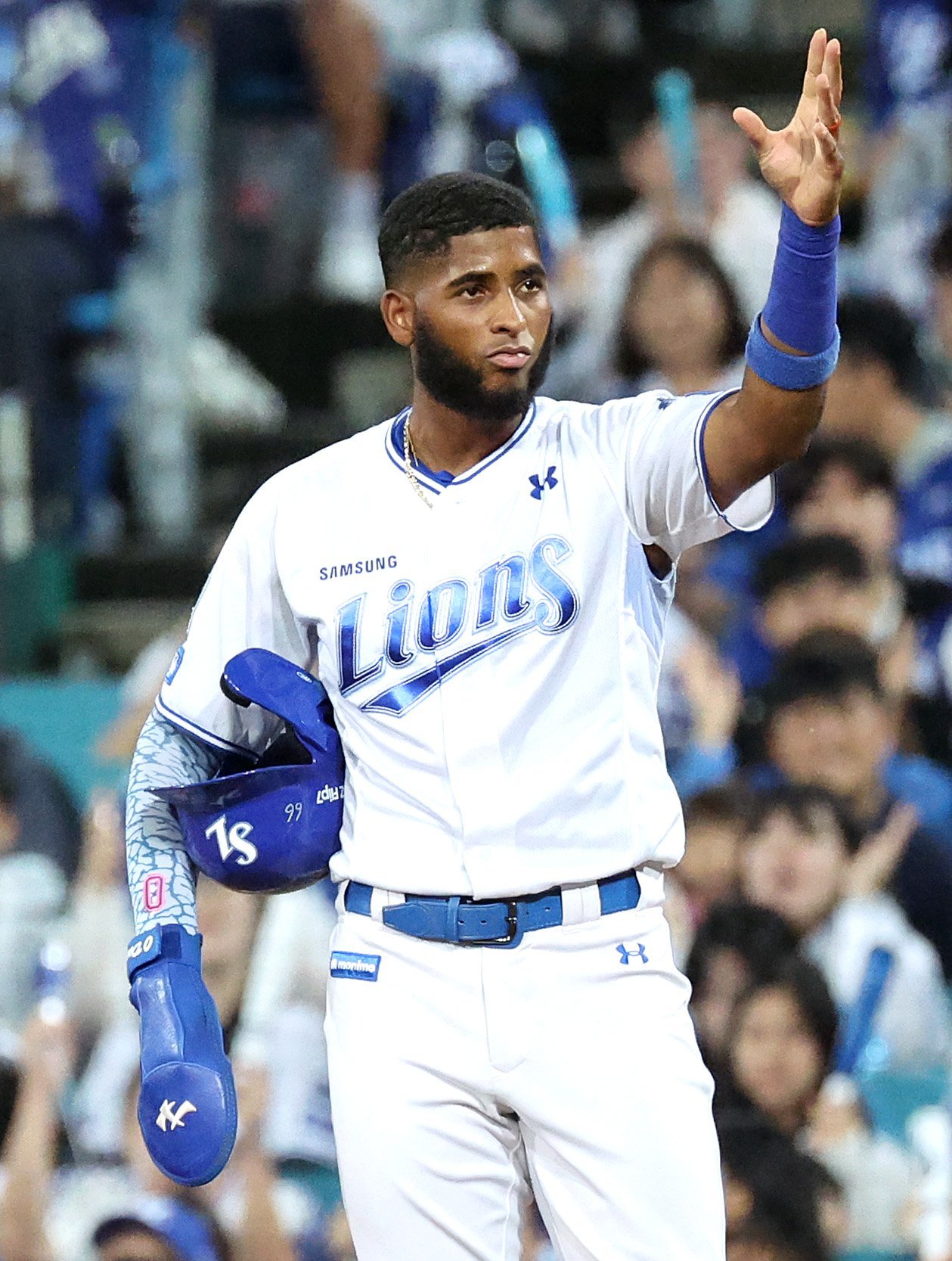 삼성 디아즈가 14일 대구 SSG와 준PO 4차전에서 8회말 결정적 2점홈런을 쳐내며 팀의 6-3 승리를 이끌었다. 시리즈 전적 3승1패를 마크한 삼성은 17일부터 한화와 PO를 치르게 됐다. 6회말 적시타를 쳐낸 뒤 환호하는 디아즈. 대구|뉴시스