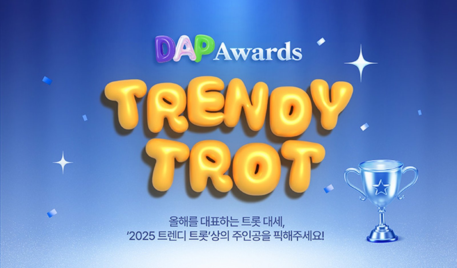 ‘트롯픽’ 측은 “DAP 2025에서 처음 신설된 시상 부문으로 트로트 아티스트들의 다채로운 매력과 대중적 영향력을 조명한다는 점에서 의미가 깊다. 트롯계의 새로운 흐름을 이끌 ‘2025 트렌디 트롯’ 상의 첫 주인공은 누가 될지 팬 여러분들의 많은 참여와 관심 부탁드린다”라고 설명했다.