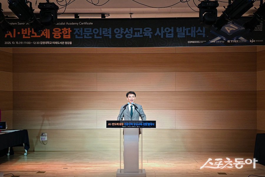 강원특별자치도(도지사 김진태)는 지난 10월 15일, 강원대학교 미래도서관에서 ‘AI·반도체 융합 전문인력 양성교육’ 발대식을 열고, 2029년까지 총 450명의 전문인력 양성에 나선다고 밝혔다(김진태 지사). 사진제공|강원도