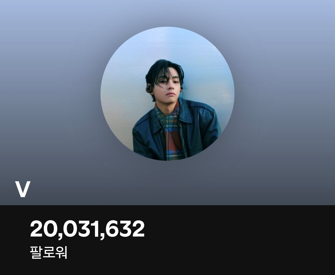 10월 5일 기준 뷔의 스포티파이 팔로워 수는 2000만1176명으로, K팝 솔로 아티스트 중 유일하게 2000만 명 고지를 넘어섰다. 이후 수치는 계속 상승해 현재 2003만1632명을 기록 중이다. 이는 K팝 전체 아티스트 중 네 번째로 높은 수치다.