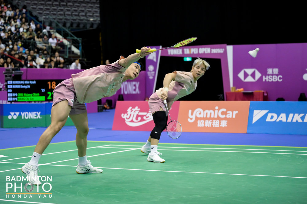 배드민턴국가대표팀 강민혁(앞)-기동주(뒤)가 부상에 발목을 잡혔다. 둘은 16일(한국시간) 덴마크 오덴세의 위스케 뱅크 아레나에서 벌어진 2025덴마크오픈 남자복식 32강에서 천보양-류이를 상대로 기권패했다. 강민혁이 오른쪽 허벅지 부상을 호소해 경기를 마치지 못했기 때문이다. 사진제공│대한배드민턴협회
