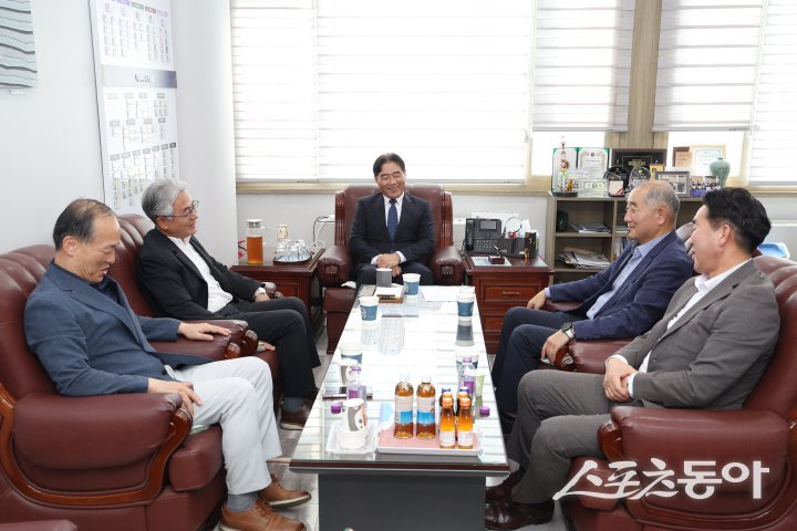 김운남 고양특례시의회 의장(가운데)은 16일 의장실에서 해군 해난구조대(SSU) 전우회 회장 및 부회장, 대한민국 해군협회 사무총장 등 주요 임원들과 차담회를 하고 있다. 사진제공ㅣ고양시의회