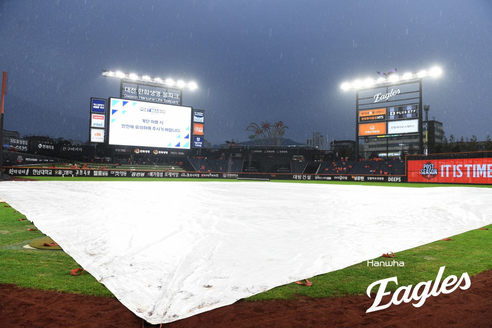 17일 대전 한화생명볼파크에 대형 방수포가 설치된 모습. 17일에 열릴 예정이었던 1차전은 경기 개시 전에 내린 많은 비로 인해 우천 취소됐다. 삼성과 한화의 플레이오프 1차전은 18일 오후 2시에 열릴 예정이다. 사진제공|한화 이글스