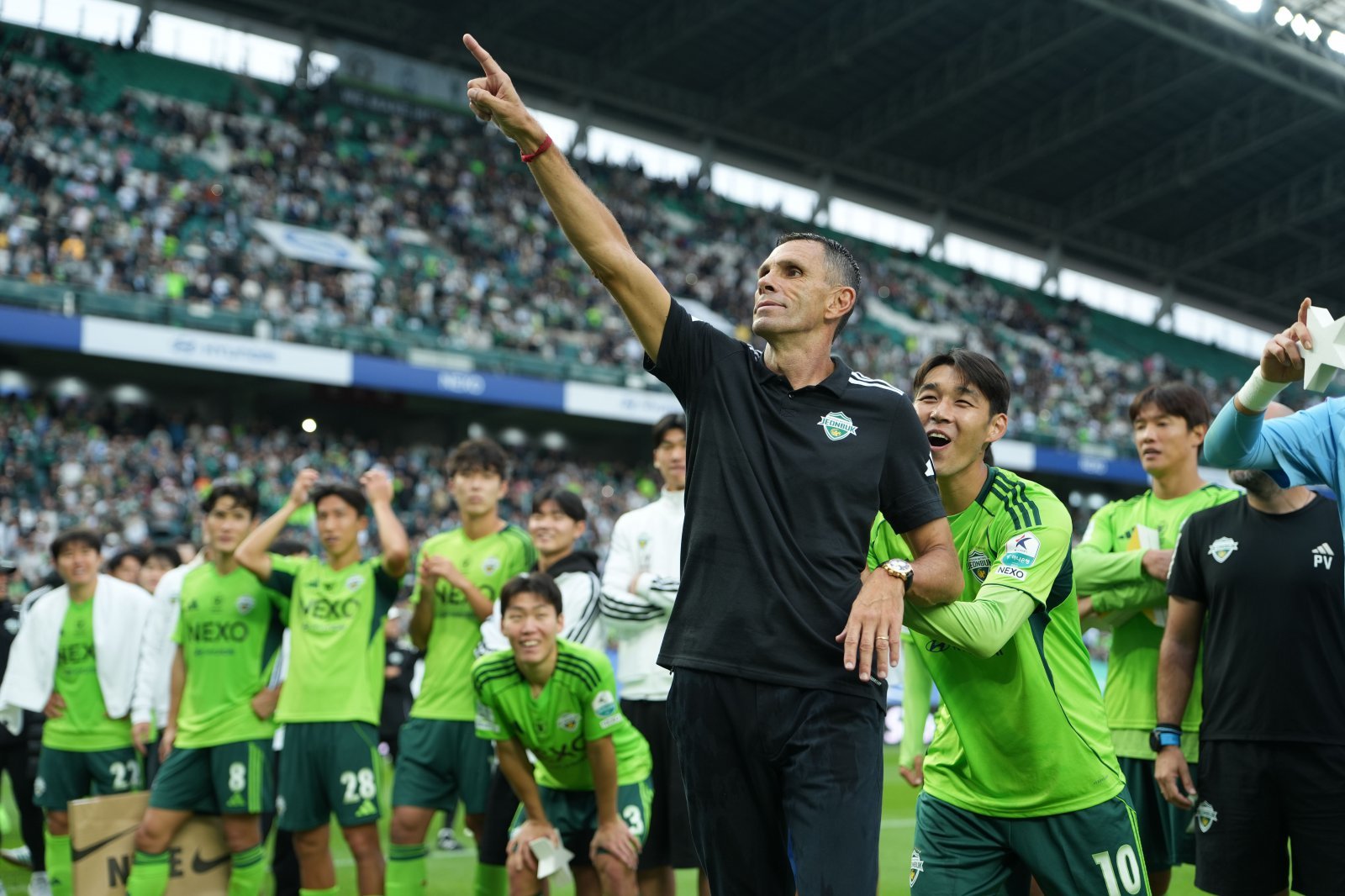 거스 포옛 전북 감독이 18일 전주월드컵경기장에서 열린 수원FC와 K리그1 정규 33라운드 홈경기에서 승리해 통산 10번째 정상을 확정한 뒤 환호하는 홈팬들에게 감사를 전하고 있다. 사진제공|전북 현대
