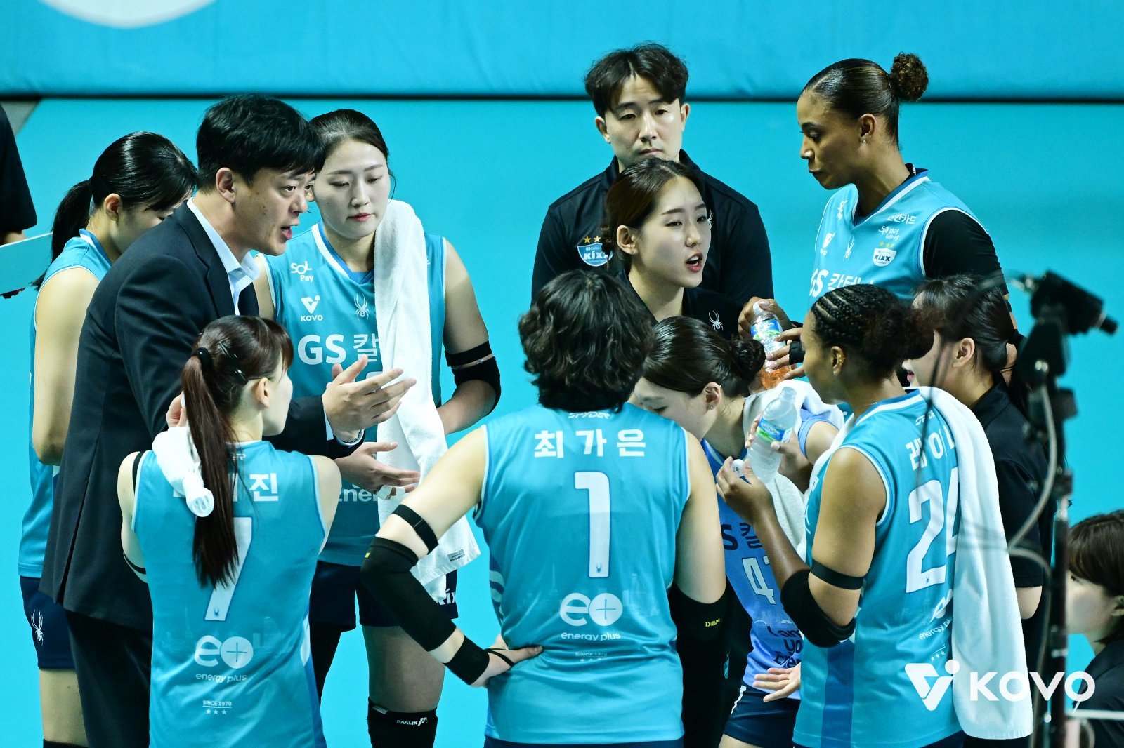 GS칼텍스 이영택 감독(왼쪽)이 19일 장충체육관에서 열린 IBK기업은행과 V리그 여자부 홈 개막전 도중 작전타임을 갖고 있다. 사진제공|KOVO