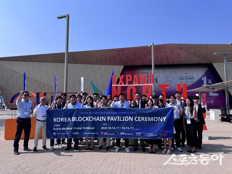 ㈜피엠그로우와 웹3 인에이블러 ㈜파라메타가 지난 12~15일 두바이 월드트레이드센터에서 열리는 지텍스 2025(Expand North Star & GITEX Global)에 공동 참가한 가운데 관계자들이 기념촬영을 하고 있다. (사진제공=㈜피엠그로우)