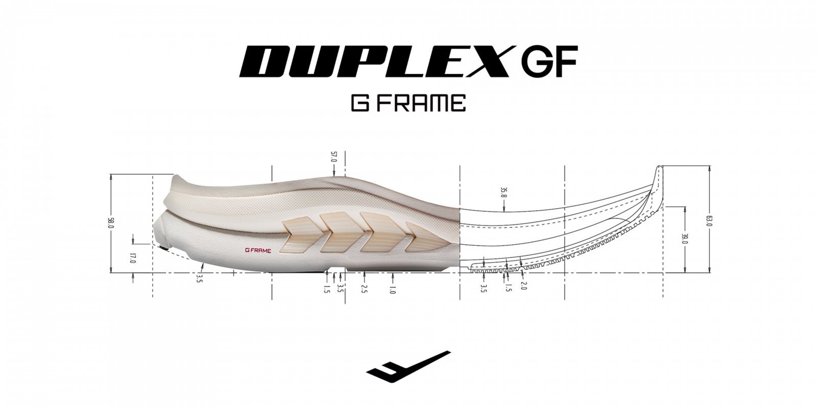 대표 제품인 듀플렉스 GF는 지면에서 발생하는 흔들림을 제어해 안정감을 높이는 ‘지프레임(G-FRAM)’ 구조와, 슈퍼폼·슈퍼라이트 소재를 결합한 이중 미드솔 설계를 적용했다.