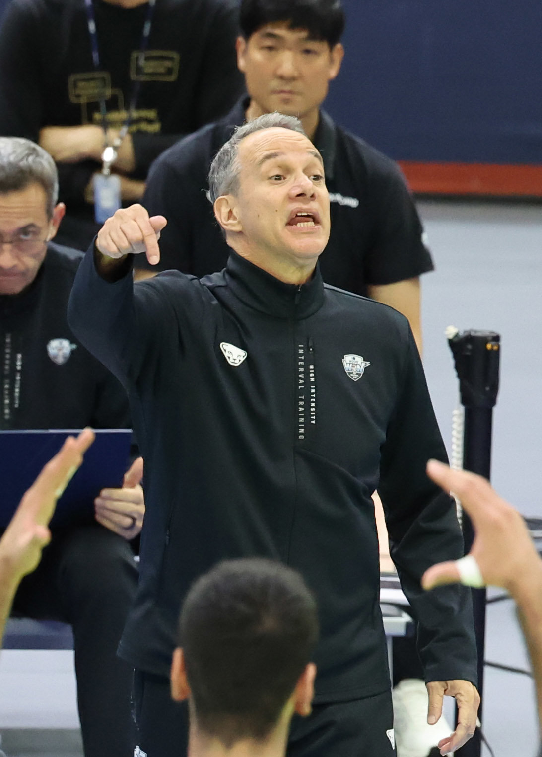 마우리시오 파에스 우리카드 감독이 20일 수원체육관에서 열린 한국전력과 ‘진에어 2025~2026 V리그’ 남자부 개막전 도중 선수들에게 작전을 지시하고 있다. 수원|뉴시스