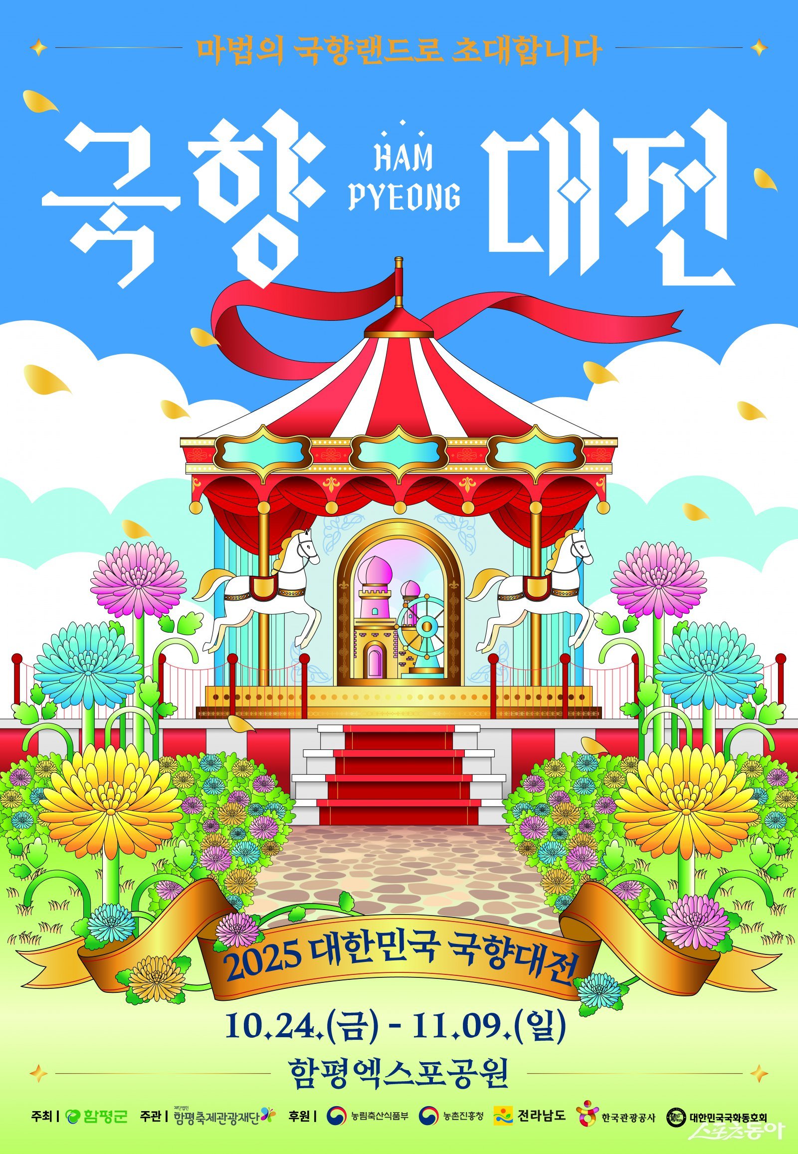 한편, 2025 대한민국 국향대전은 오는 10월 24일부터 11월 9일까지 17일간 함평엑스포공원 일원에서 ‘마법의 국향랜드’를 주제로 회전목마와 대관람차, 마법의 성 등 대형 국화조형물과 명품 국화분재 작품 전시, 브라스밴드 거리공연, 마법의 휴먼포토 등 다양하고 생동감 있는 전시·공연·체험프로그램으로 관람객을 맞이할 예정이다.