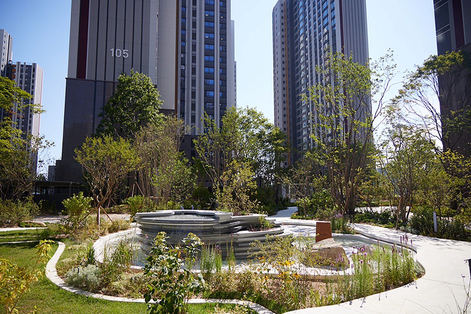 실제 정원이 처음 적용된 ‘천안 롯데캐슬 더 청당’은 ‘순수한 자연과의 조우(Communication in Fine Nature)’를 콘셉트로, 계곡 숲과 빛의 경관을 정원에 구현했다. 정원 중앙의 수경 시설은 유려한 곡선미와 레이어링 기법을 통해 물과 바위, 빛의 요소를 재해석하고 입체적 공간감을 부여해 고유의 정원 감성을 형성했다.