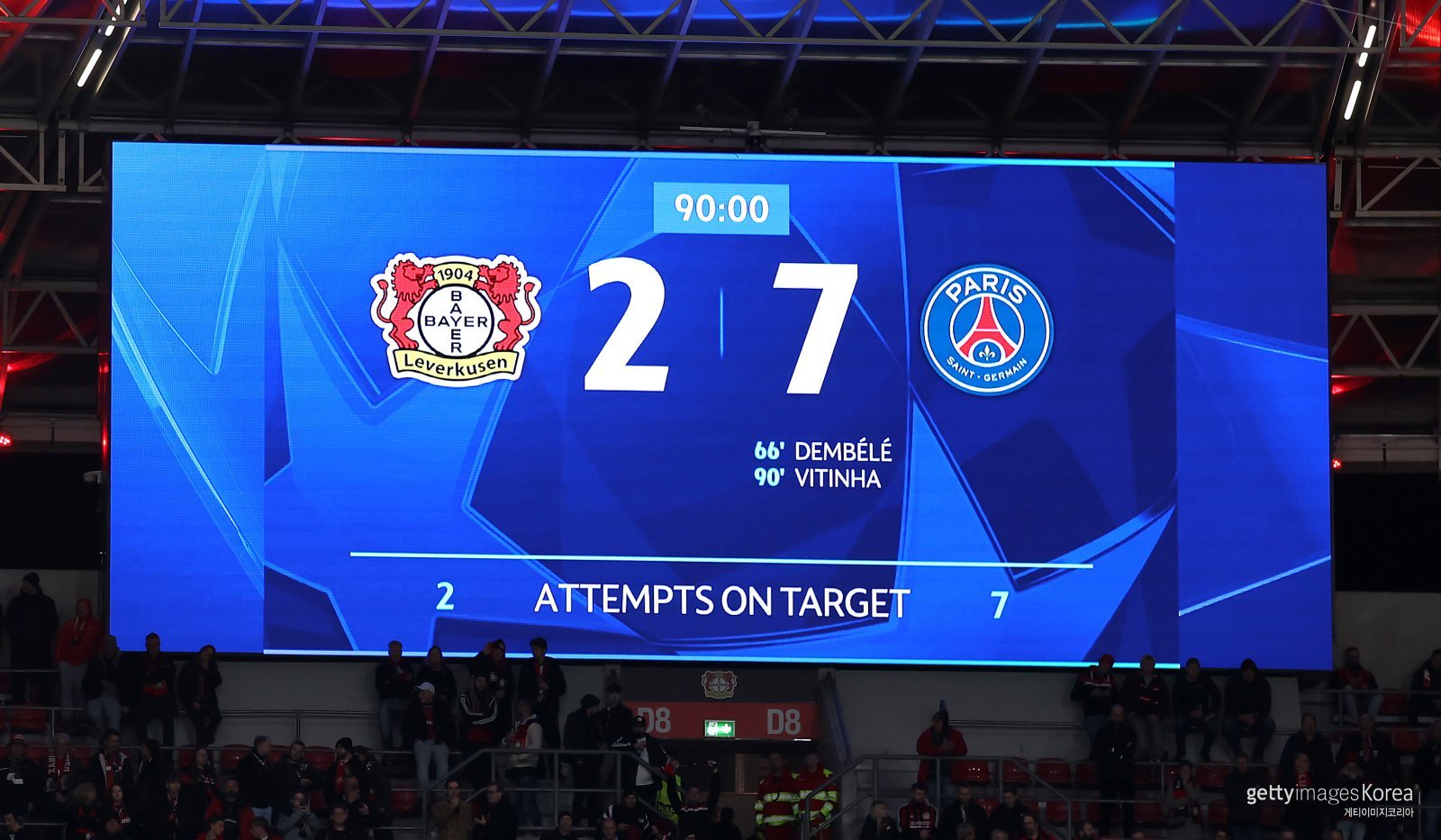 이날 PSG는 압도적인 전력 차이를 자랑한 끝에 레버쿠젠을 7-2로 대파했다. 원정경기에서 7골을 퍼부으며 5골 차 승리를 거둔 것.
