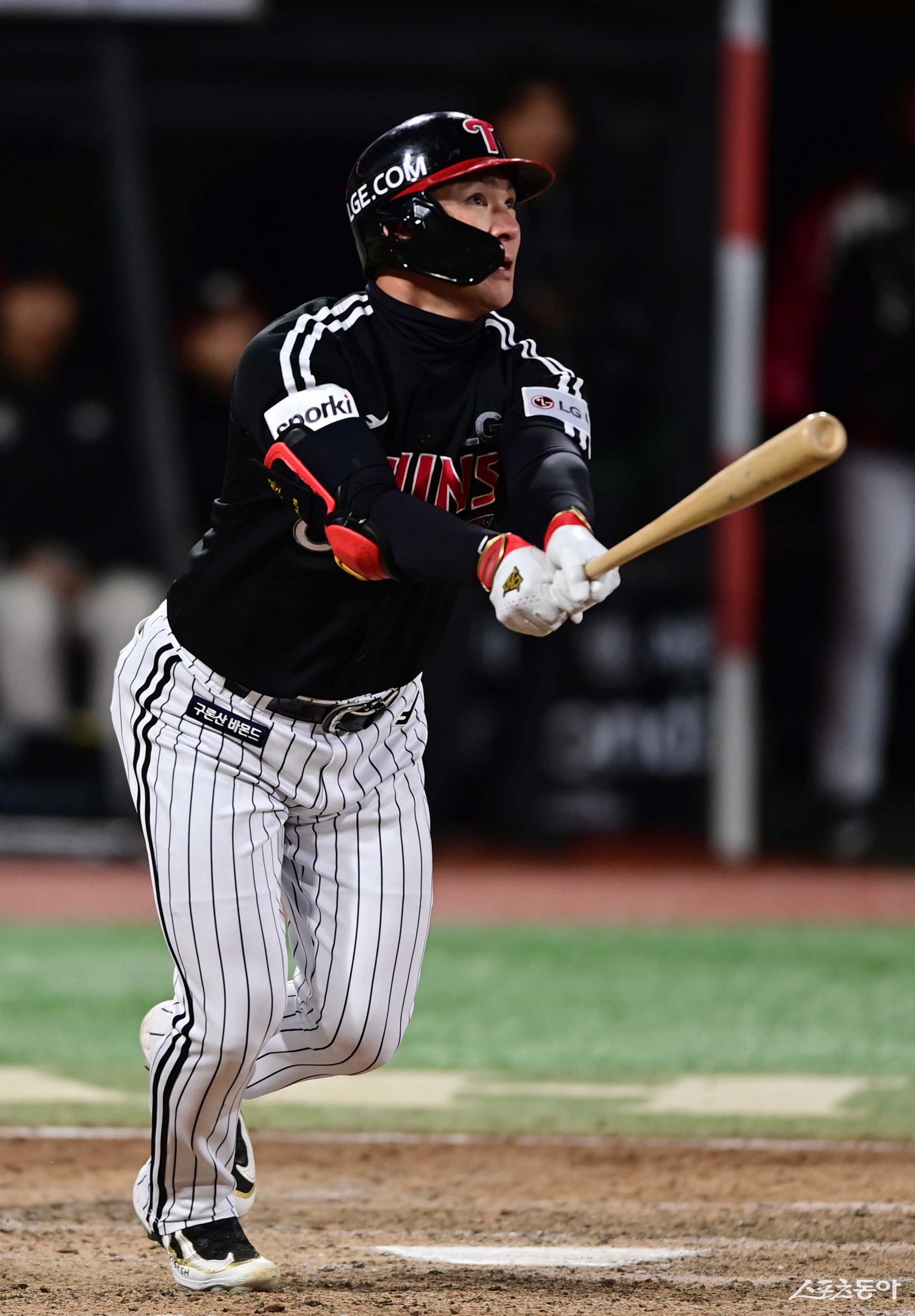 LG 오지환이 2023년 11월 10일 수원KT위즈파크에서 열린 한국시리즈 3차전 9회초 2사 1·2루서 역전 결승 3점홈런을 치고 있다. 스포츠동아DB