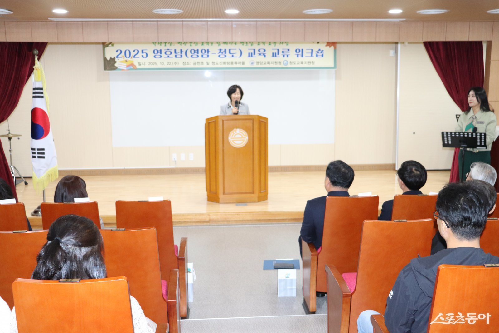 오홍현 청도교육장이 ‘하반기 영호남(청도·영암) 교육 교류 워크숍’에서 인사말을 하고 있다. 사진제공 ㅣ 청도군