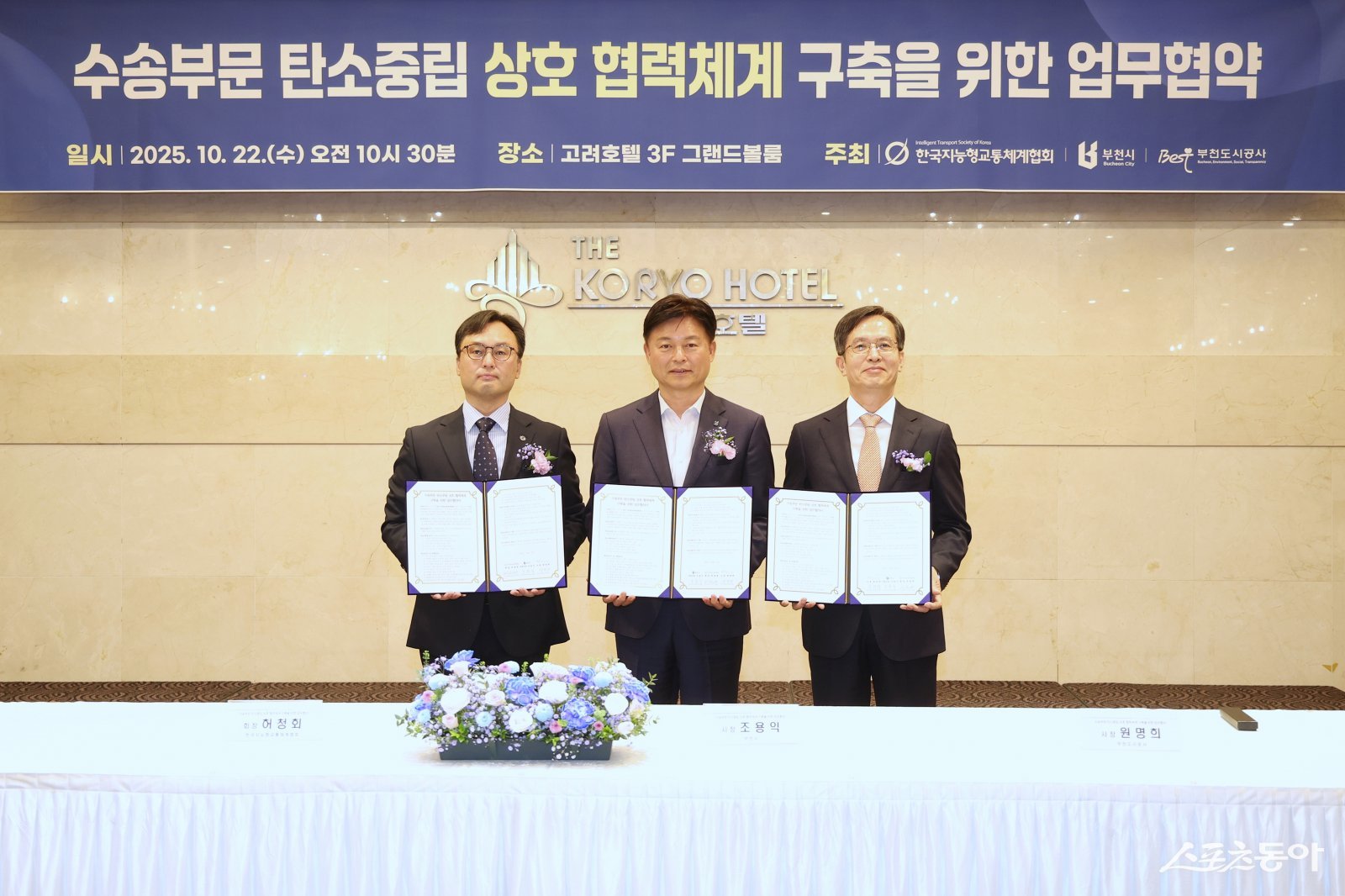부천시는 지난 22일 부천 고려호텔에서 한국지능형교통체계협회(ITS Korea), 부천도시공사와 함께 ‘수송부문 탄소중립 상호 협력체계 구축을 위한 업무협약’을 체결했다(왼쪽부터 허청회 ITS Korea 회장, 조용익 부천시장, 원명희 부천도시공사 사장이 협약체결 기념사진을 찍고 있다). 사진제공|부천시