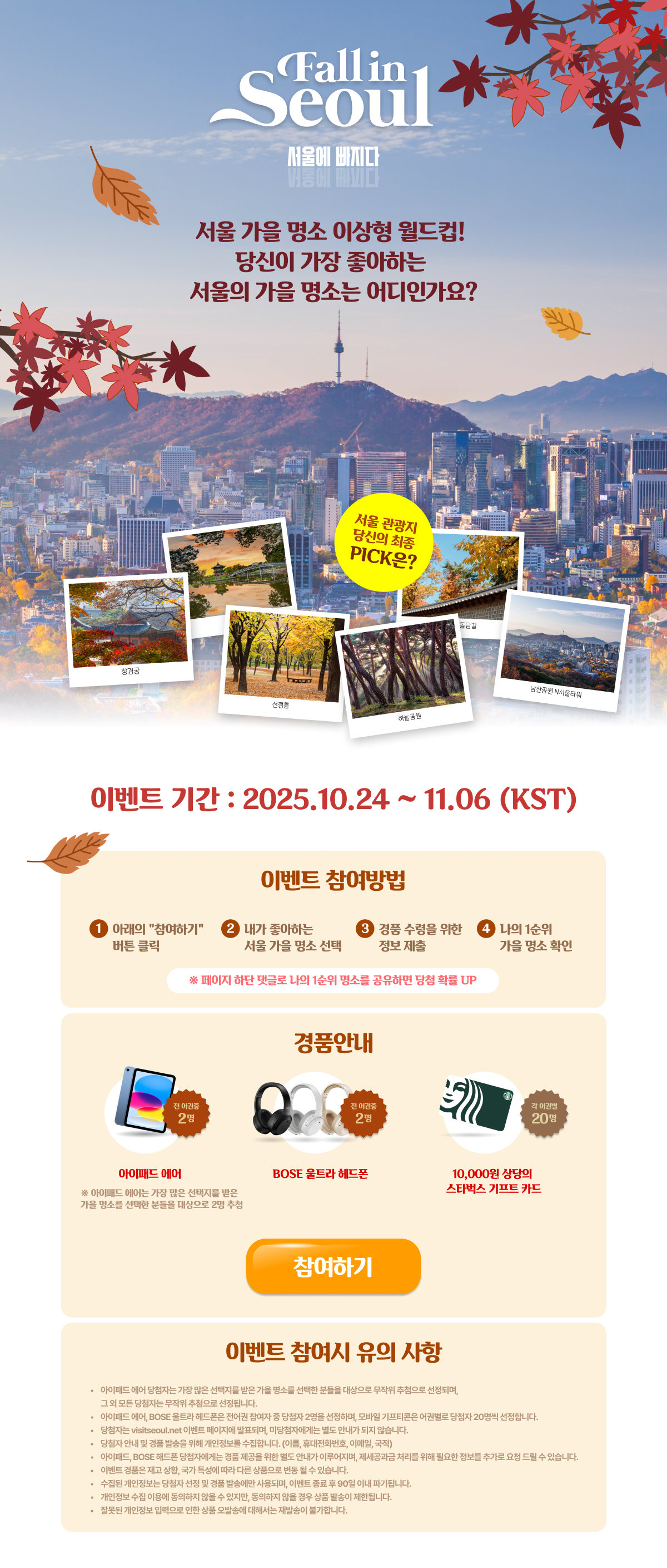 온라인에서는 ‘폴 인 서울(Fall in Seoul)’ 이벤트가 10월 24일부터 11월 6일까지 2주간 열린다. 서울의 가을 명소를 주제로 한 이상형 월드컵 형식의 콘텐츠로, 경복궁·서울달·남산공원 등 다양한 명소가 후보로 등장한다. 이용자는 라운드마다 선호하는 장소를 선택해 자신만의 ‘서울 가을 여행지’를 완성하게 된다.