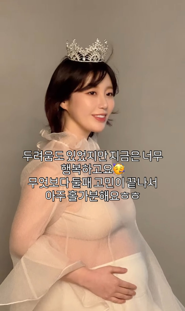 이어 “도전조차 안 하면 나중에 후회할 것 같아서 일단 가보자 했는데 너무나 감사하게도 한방에 찾아와준 우리 아가. 두려움도 있었지만 지금은 너무 행복하다. 둘째 고민이 끝나서 아주 홀가분하다”며 “우리 부부가 두 아이의 부모라니 많이 떨리기도 하지만 잘 준비해보겠다”고 소감을 밝혔다. 그는 현재 임신 13주차라면서 내년 4월 출산 예정이라고 설명했다.
