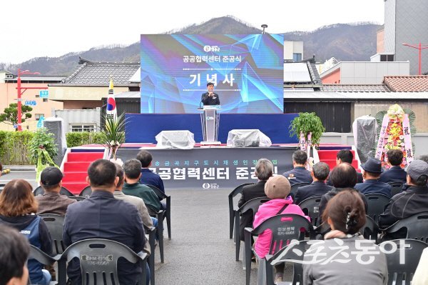 윤경희 청송군수기 ‘청송금곡지구 도시재생인정사업’의 공공협력센터 준공식에서 인사말을 하고 있다. 사진제공 ㅣ 청송군