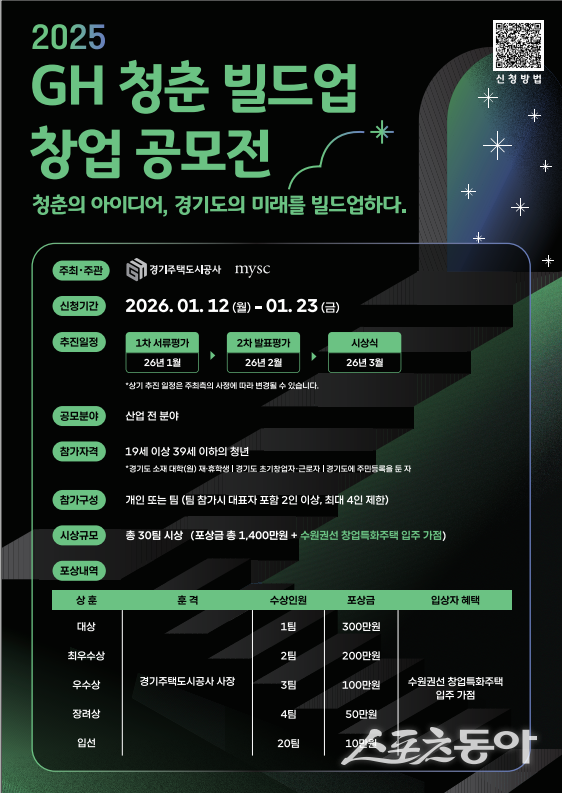경기주택도시공사(GH)는 청년들의 참신한 창업 아이디어를 발굴하고 지원하기 위해 ‘2025 GH 청춘 빌드업 창업 공모전’을 24일 공고했다고 밝혔다. 이번 공모전은 ‘청춘의 아이디어, 경기도의 미래를 빌드업하다!’를 슬로건으로 내걸고, 산업 전 분야를 대상으로 진행된다.