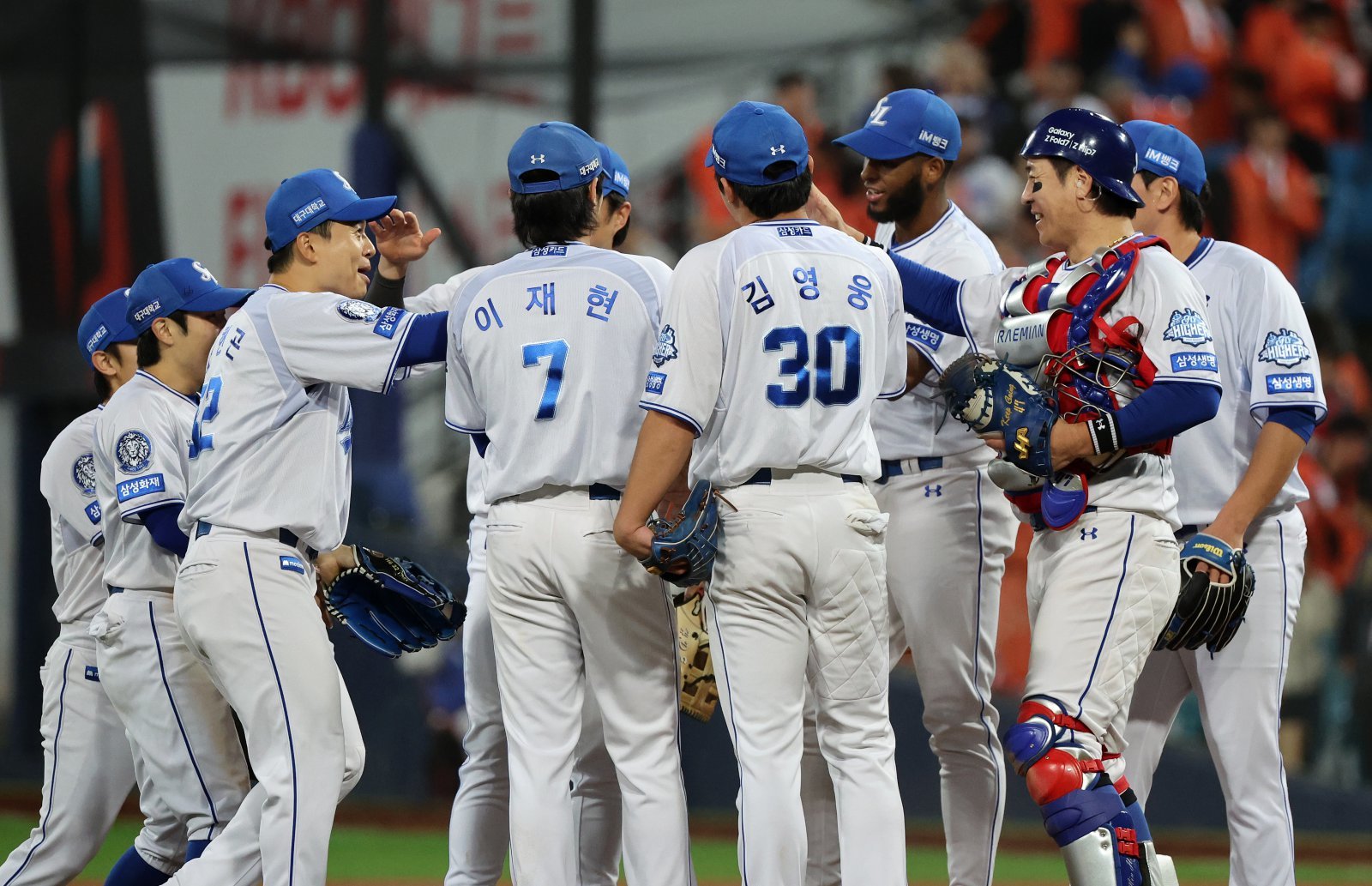 삼성은 올 시즌 전반기를 8위로 마쳤지만, 후반기 들어 탄탄한 전력을 뽐내며 PS에서도 총 11경기를 치렀다. 무엇보다 이재현(7번), 김영웅(30번) 등 젊은 선수들을 앞세워 승리 DNA를 구축한 게 큰 수확이었다. 22일 PO 4차전서 7-4로 승리한 뒤 기뻐하는 삼성 선수들. 뉴시스