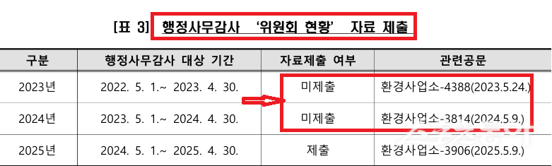 행정사무감사 자료 제출에서도 부적절한 업무처리가 드러났다. 환경사업소는 2023년과 2024년도 행정사무감사 시 ‘위원회 현황’ 자료를 누락 제출했다. 이에 대해 “담당자 인사이동 과정에서 단순 실수로 인한 미제출”이라고 해명했다. 그러나 감사에서는 “누락 경위 설명이 불충분하고, 동일한 오류를 반복한 것은 고의적 누락으로 의심된다”고 지적했다.