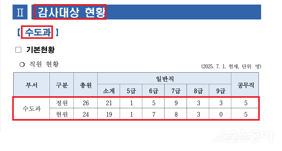 지난 10월 16일 감사 결과에 따르면 수도과는 ▲연가보상비 과다 지급 ▲시간외근무수당 계산 착오 ▲병가 부당사용 ▲보안교육 미실시 ▲저수조 위생관리 소홀 ▲수도요금 체납관리 미흡 ▲신용카드 결제계좌 및 포인트 세입조치 부적정 ▲업무추진비 집행계획 미수립 ▲물품관리 미등록 등 총 12건이 넘는 위반 사항이 확인됐다.