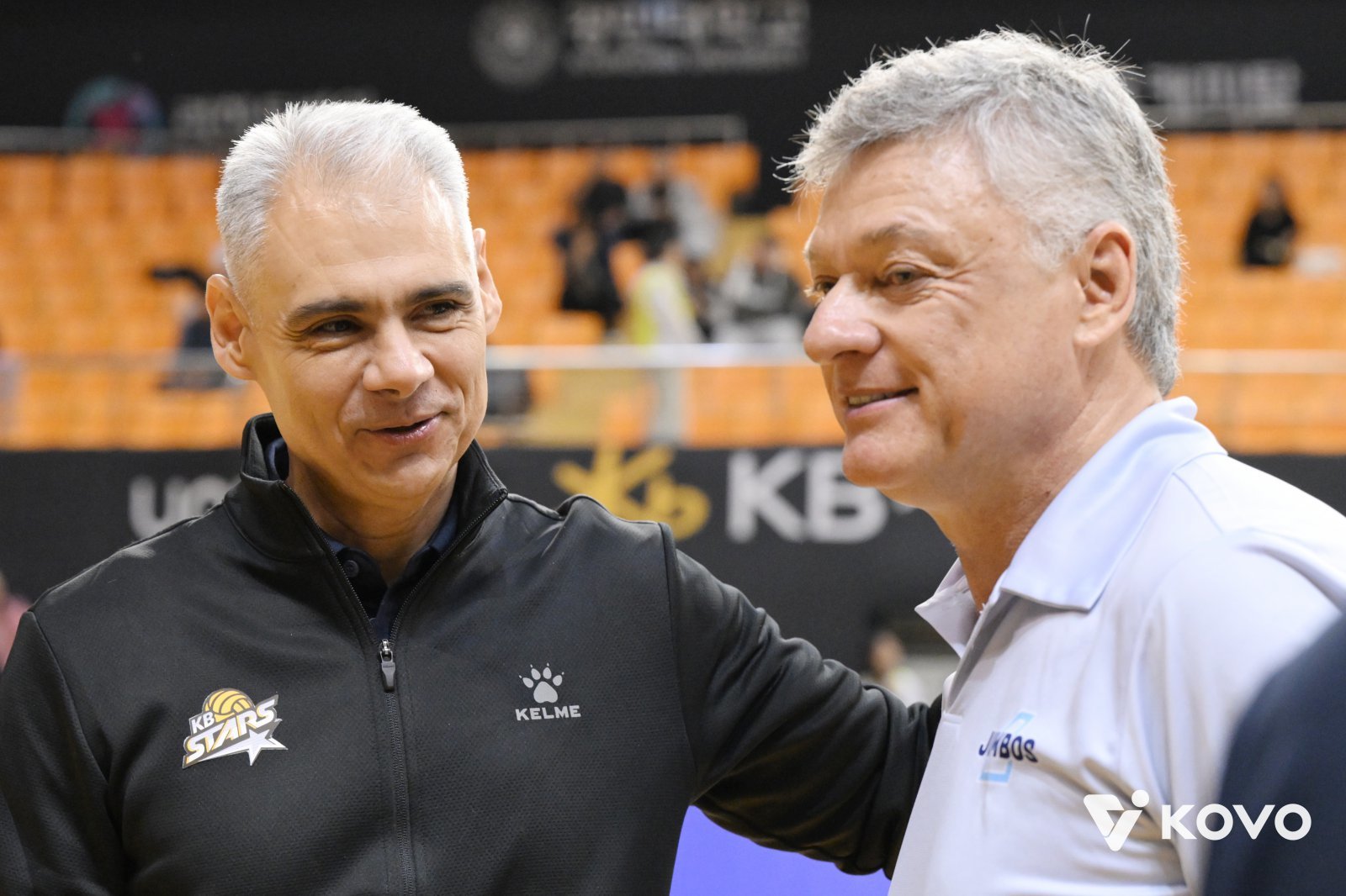 레오나르도 아폰소 KB손해보험 감독(왼쪽)과 헤난 달 조토 대한항공 감독이 26일 의정부 경민대기념관에서 열린 맞대결에 앞서 조우하고 있다. 사진제공|KOVO