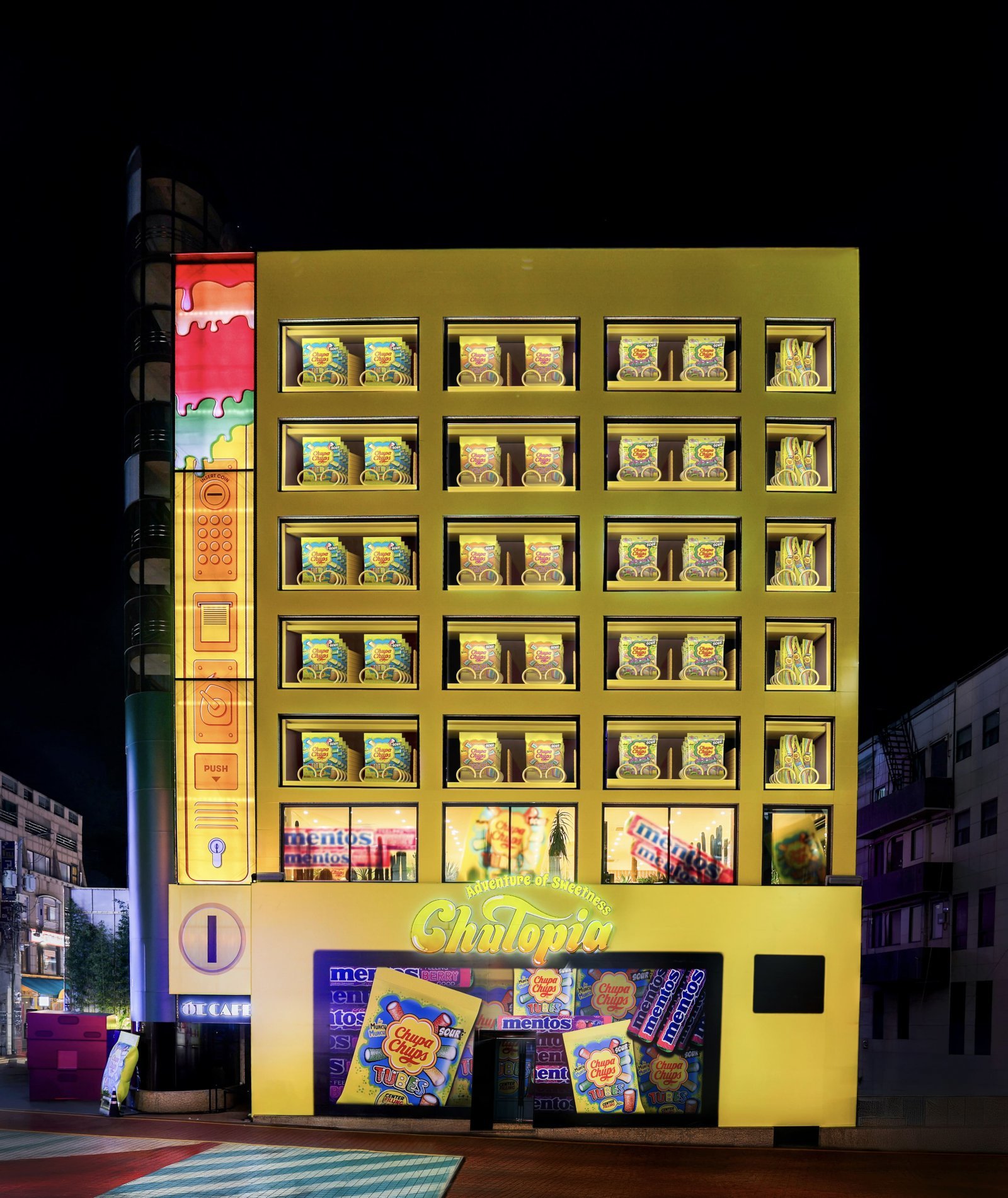 외관은 대형 간식 자판기를 떠오르게 하는 파사드로 동화같은 비주얼이 눈길을 끈다. 자판기 속으로 들어가는 착각을 주는 토출구 형태의 입구를 지나면 츄파춥스와 멘토스로 채워진 간식 자판기 속에서 달콤한 여정을 경험할 수 있다.