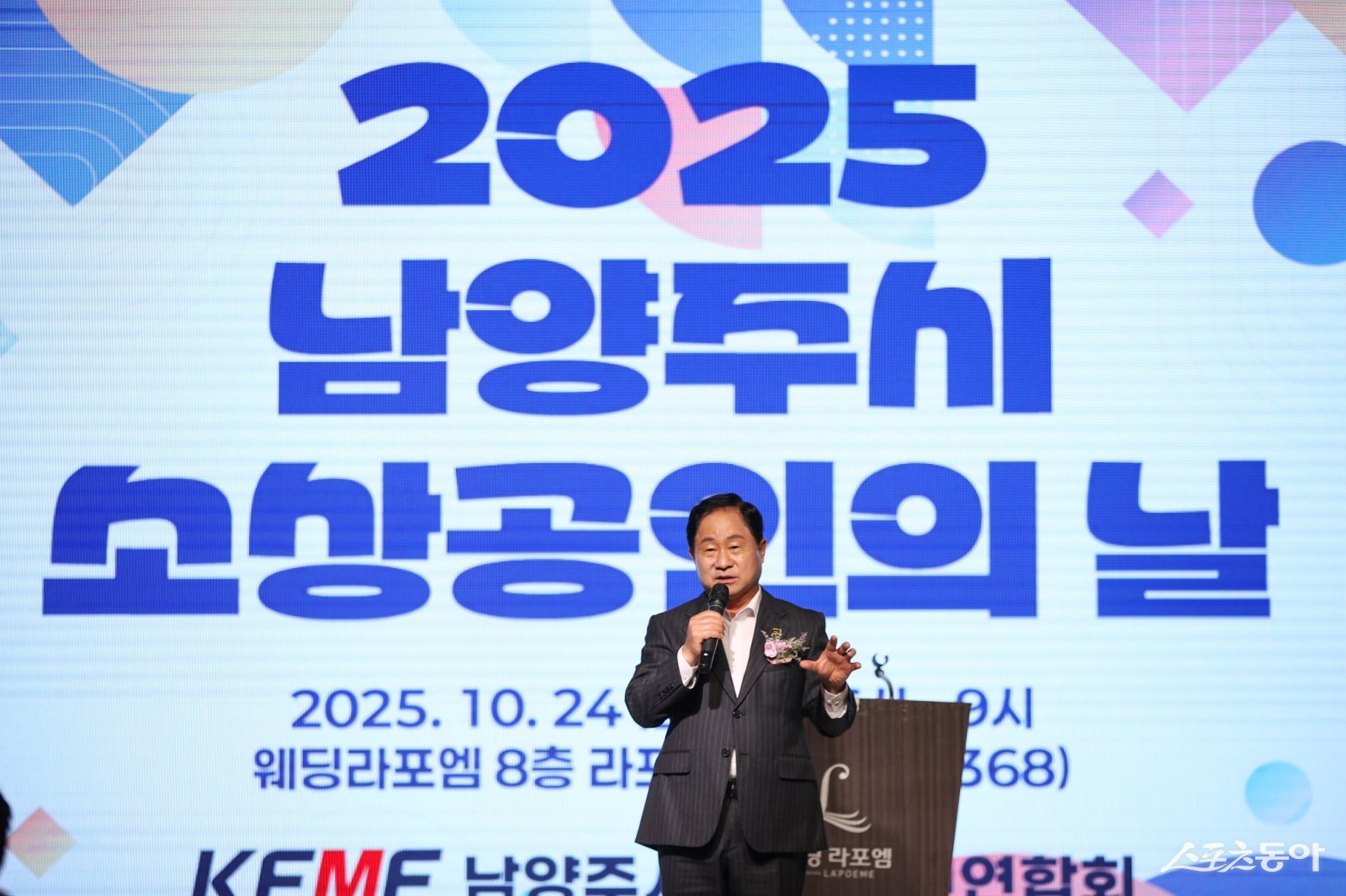 주광덕 시장은 지난 24일 다산동 브릭스타워 웨딩라포엠에서 ‘2025년 소상공인의 날 인사말을 하고 있다. 사진제공ㅣ남양주시