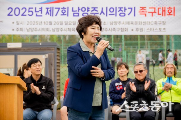 이정애 부의장은 ‘제7회 남양주시의회 의장기 족구대회에서 인사말을 하고 있다. 사진제공ㅣ남양주시의회